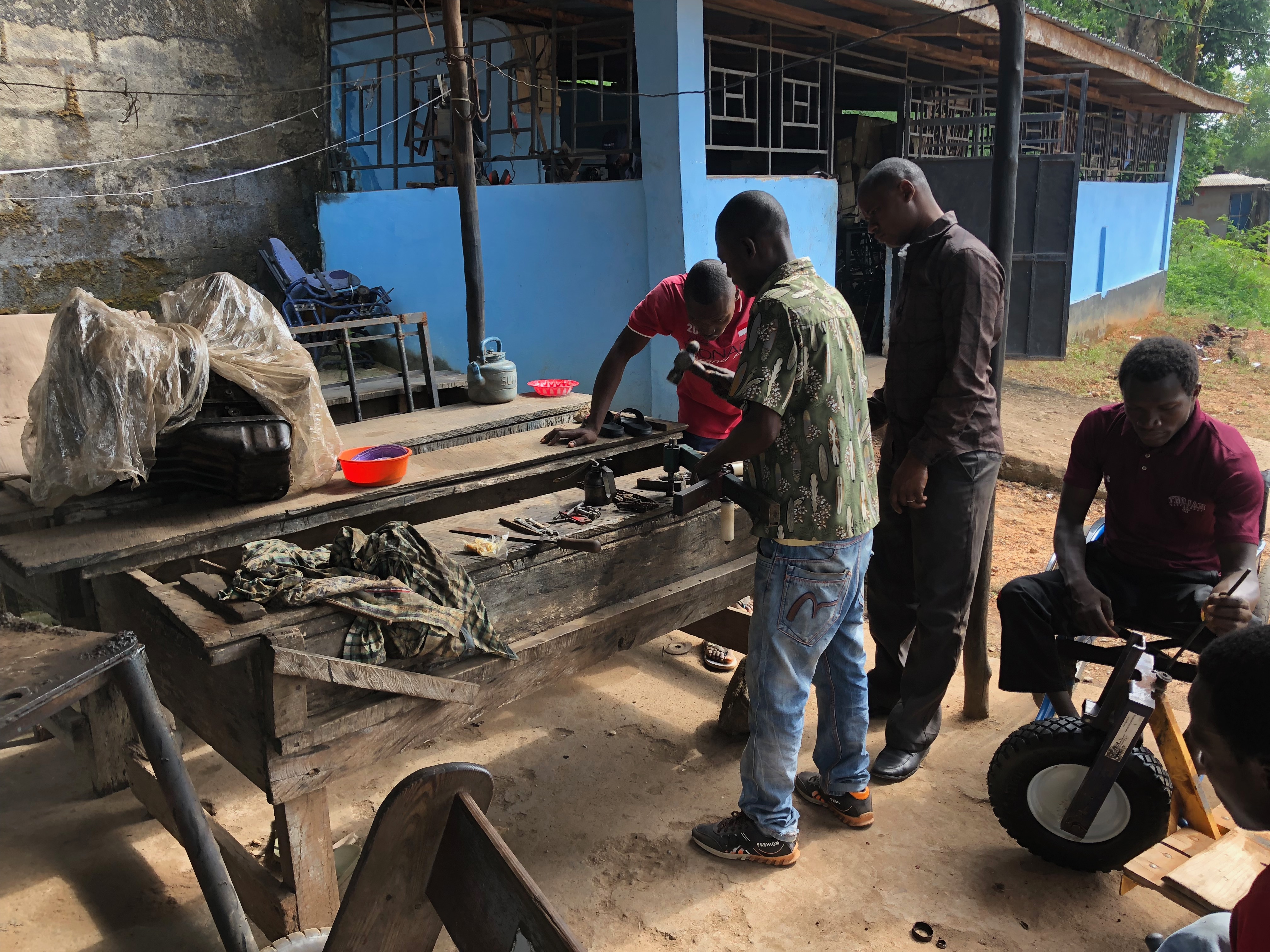 On Friday we took Smith Tamba Barclay (another young man preparing for a mission) and Ibrahim Morison (a polio victim who is a member of our Burma Branch) to Bo. Smith needed an interview with a member of the mission presidency and President Musa said he could do it as long as he was done by 10:00 am. So we dropped him off at President Musa’s and then took Ibrahim to the Cheshire House where they were able to repair his wheelchair. Cheshire House is another amazing organization that helps out polio victims and helps them get through high school. They also have a workshop there were they make and repair wheelchairs. LDS Charities has played a big role in helping to provide them equipment and materials to make and repair wheelchairs. The wheelchairs are then delivered to the Bo Government Hospital who then fits them to disabled individuals in need of some degree of mobility. Ibrahim was so happy to get a new front tire, new front brake and new sprockets to keep his chain from slipping when going uphill. It made our hearts glad to help out both of these young men further there own dreams of being self-reliant and contributing members of the church and the country.