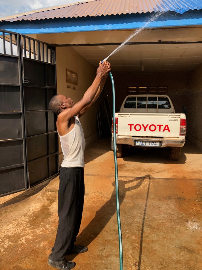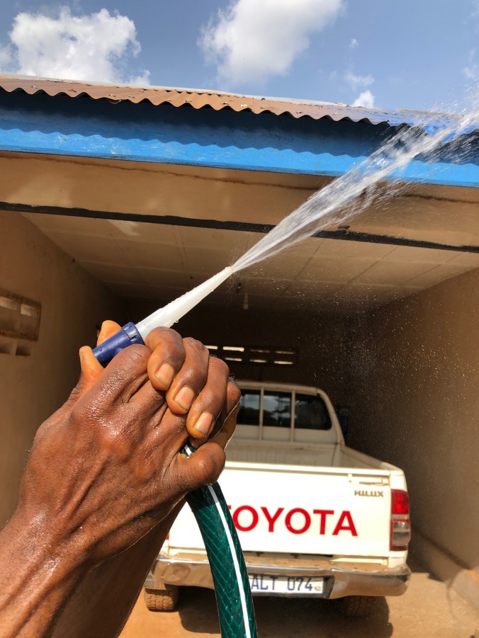 union since they don’t have faucets with hose threads. I needed a nozzle on the other end to spray water on the roof. There is apparently no hose nozzle anywhere in Kenema, so instead he hooked up a sprayer head that you might use in a sink to rinse your dishes. The first time I turned on the high pressure pump the end went flying right off the end
