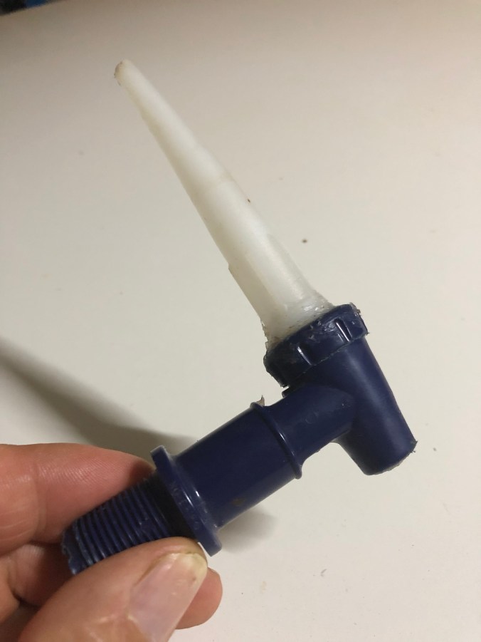 of the hose. I asked Charles if he could get me a couple of hose clamps, he assured me he could and actually brought them by and installed them today while we were gone. Still, when I turned on the pump, the water shot about 10 feet and died. Needless to say, that didn’t work. However, when Charles came to work he was determined to figure this out. We had an old bucket with a spigot such as you would find on a 5-gallon thermos for filling a cup. Charles took that off the bucket and then with
