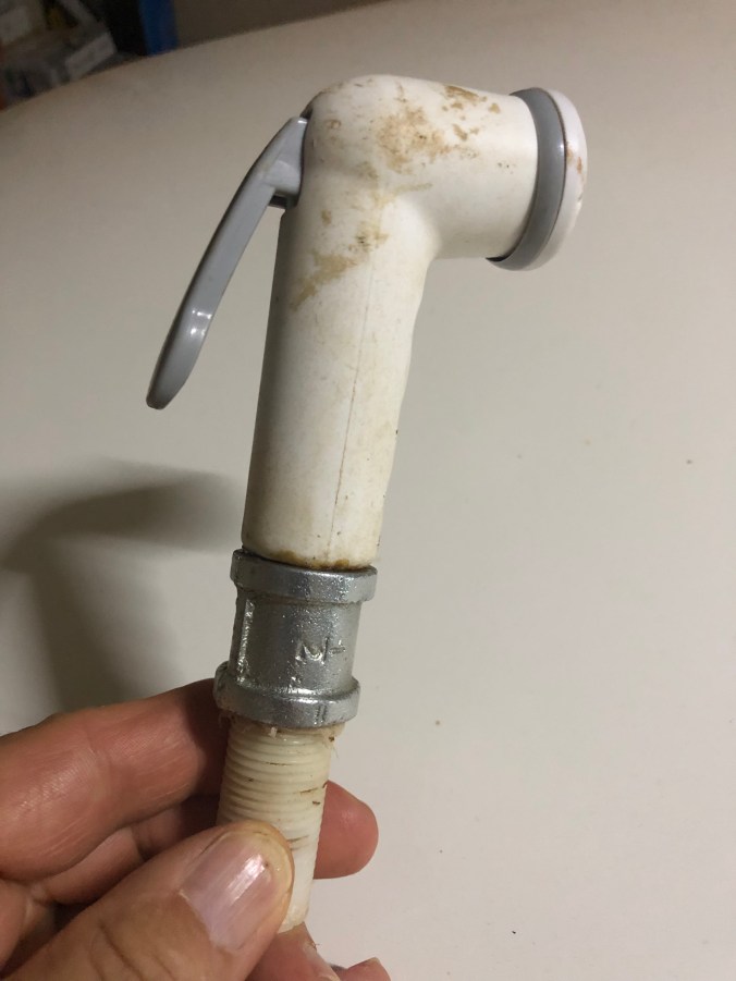 some good ingenuity, reconfigured it using the nozzle off of a tube of silicon caulk (called glue here) and a modified rubber gasket. The back side of the nozzle had a hole where the handle to the spigot had previously been so we covered that with our thumbs and it worked. We took it one step further by filling the hole with caulk, hoping that it might relieve some of the pressure required by the thumb. A pretty creative solution. In the meantime, I have ordered some proper hose ends and a nozzle from Amazon and will have it shipped over.