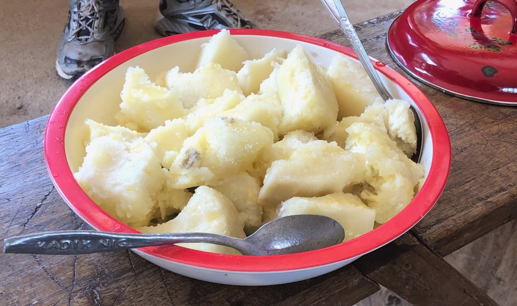 After the lesson was over, Sister Messi again provided a small lunch. This time it was yams in a margarine sauce. Delicious! What you see in this picture is a “communal” plate that several of us ate from. The African yam is an extremely large tuber that provides plenty of complex carbohydrates, and healthy fiber. It is also a good source of B complex vitamins like Vitamin B6, Vitamin B1, riboflavin, folic acid, pantothenic acid and niacin. And did I mention it is delicious?