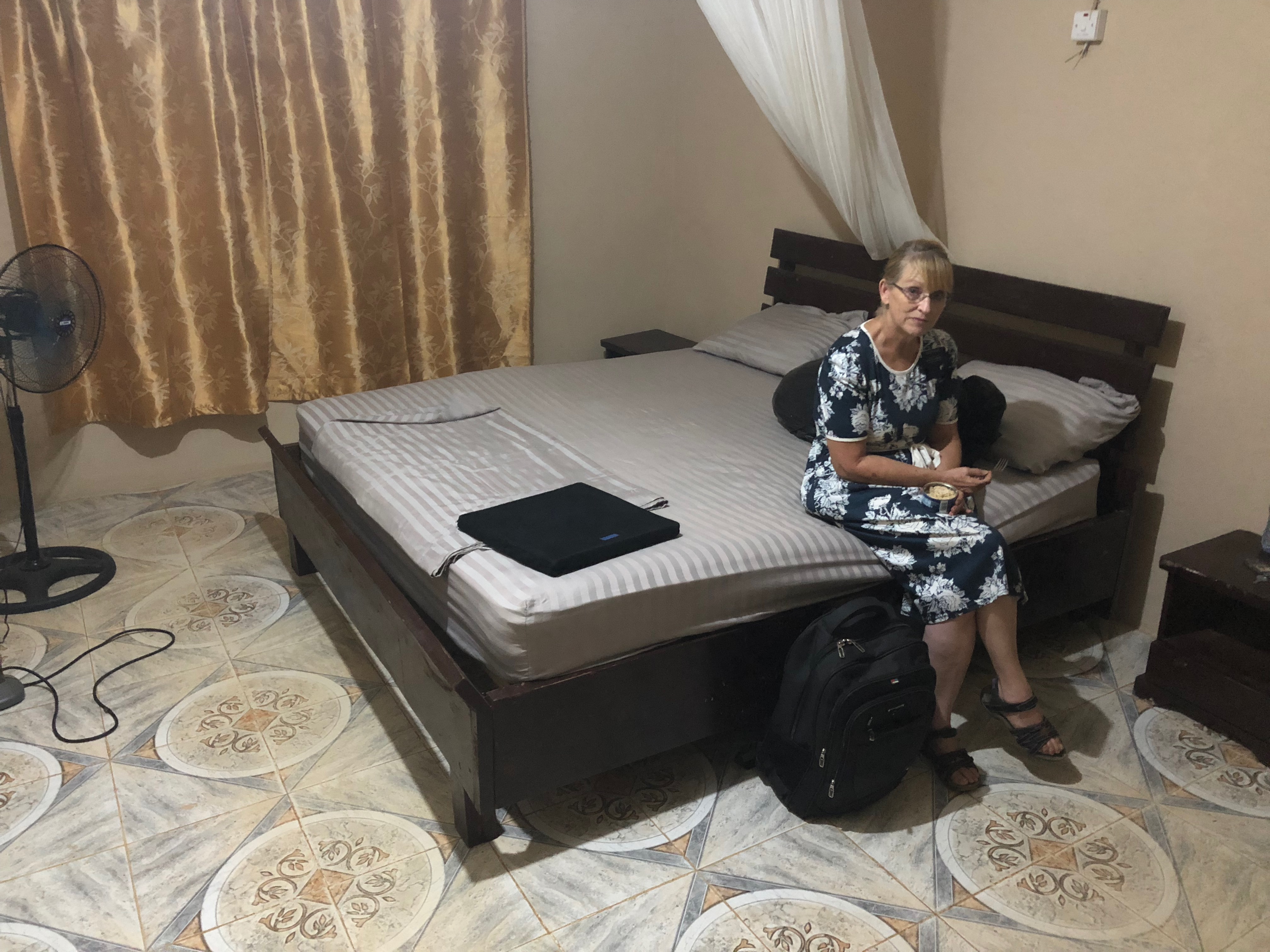 We left there and went to our guesthouse. It was essentially a three room bed and breakfast Africa style. We were the only guests there. It was clean and the guy in charge was very hospitable. They did not have a/c, but did have solar power that lasted until about midnight. When the fan died, I woke up and struggled to get back to sleep for an hour or so. The loud music coming from somewhere outside did not help. Finally at 2 am the music stopped and I fell back to sleep. I have no idea how LaDawn slept through all that. Right as we went to sleep, the water in the bathroom stopped working. We weren’t that surprised, as we seem to have a negative effect on water in general and pipes and pumps specifically. In the morning when we got up the guy in charge got it working again. He also cooked us a nice breakfast with a fried omelet of sorts, fried plantains and some delicious fresh fullah bread. We were grateful even though we came prepared with out own food just in case.