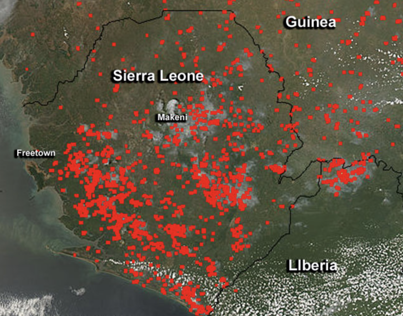 Surprisingly there were not, as I suspect it is so common as to not garner headlines. However, I did find an image from NASA dating back to 2015, showing the number of fires in Sierra Leone in the month of March. Much of this is attributed to agricultural fires prior to planting new crops, but undoubtedly some of these are roadside fires as well.