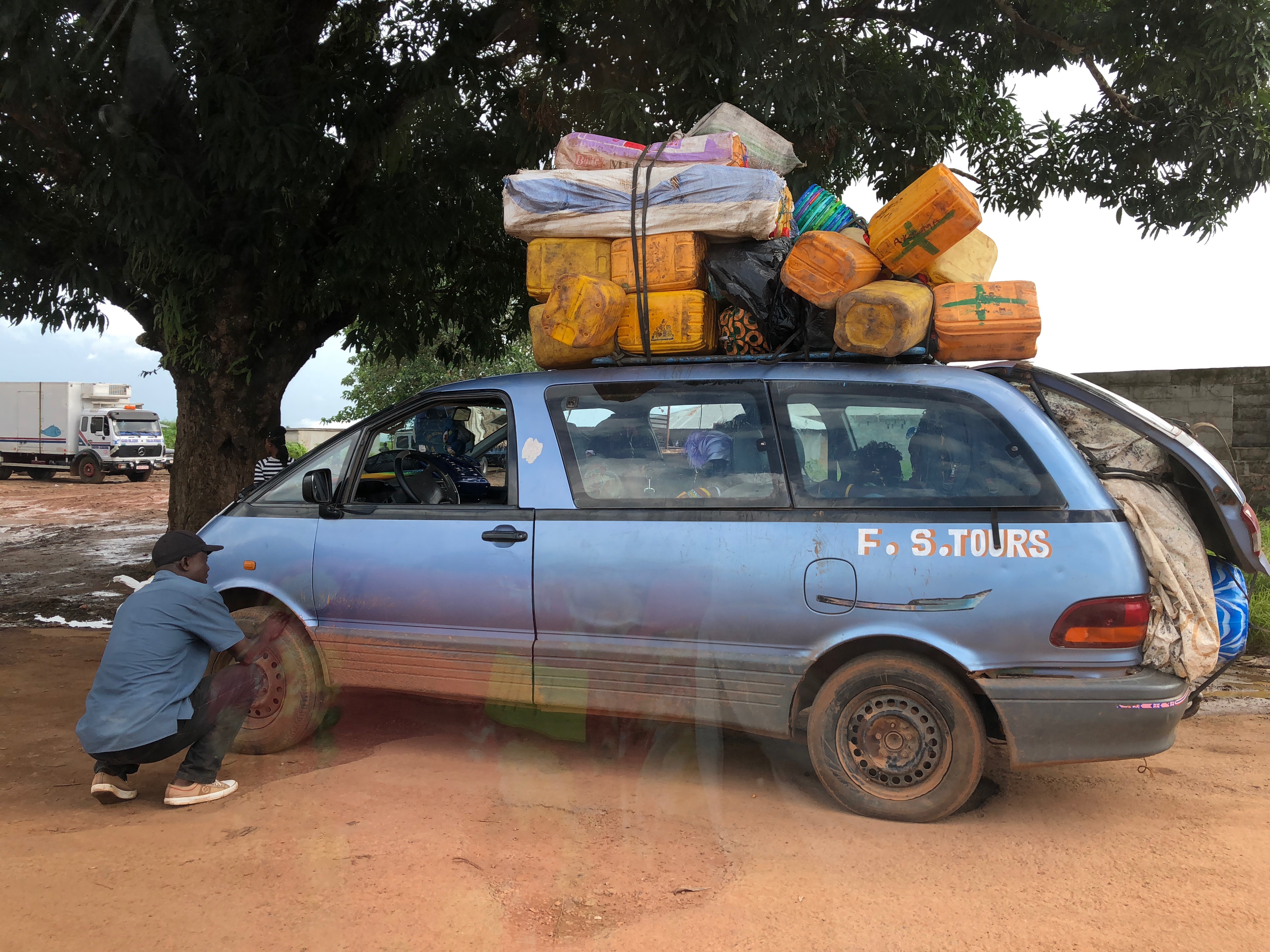 Vans that are stacked incredibly high with doors or trunks often tied shut because they will not close due to the amount of “stuff” they are carrying. This week we saw a big truck carrying a load (we are not sure what it was, perhaps cocoa beans) and there was a guy standing on the cab of the truck leaning against the bags behind him. I shudder to think what would happen if that truck had to stop suddenly. Okay, but I digress….