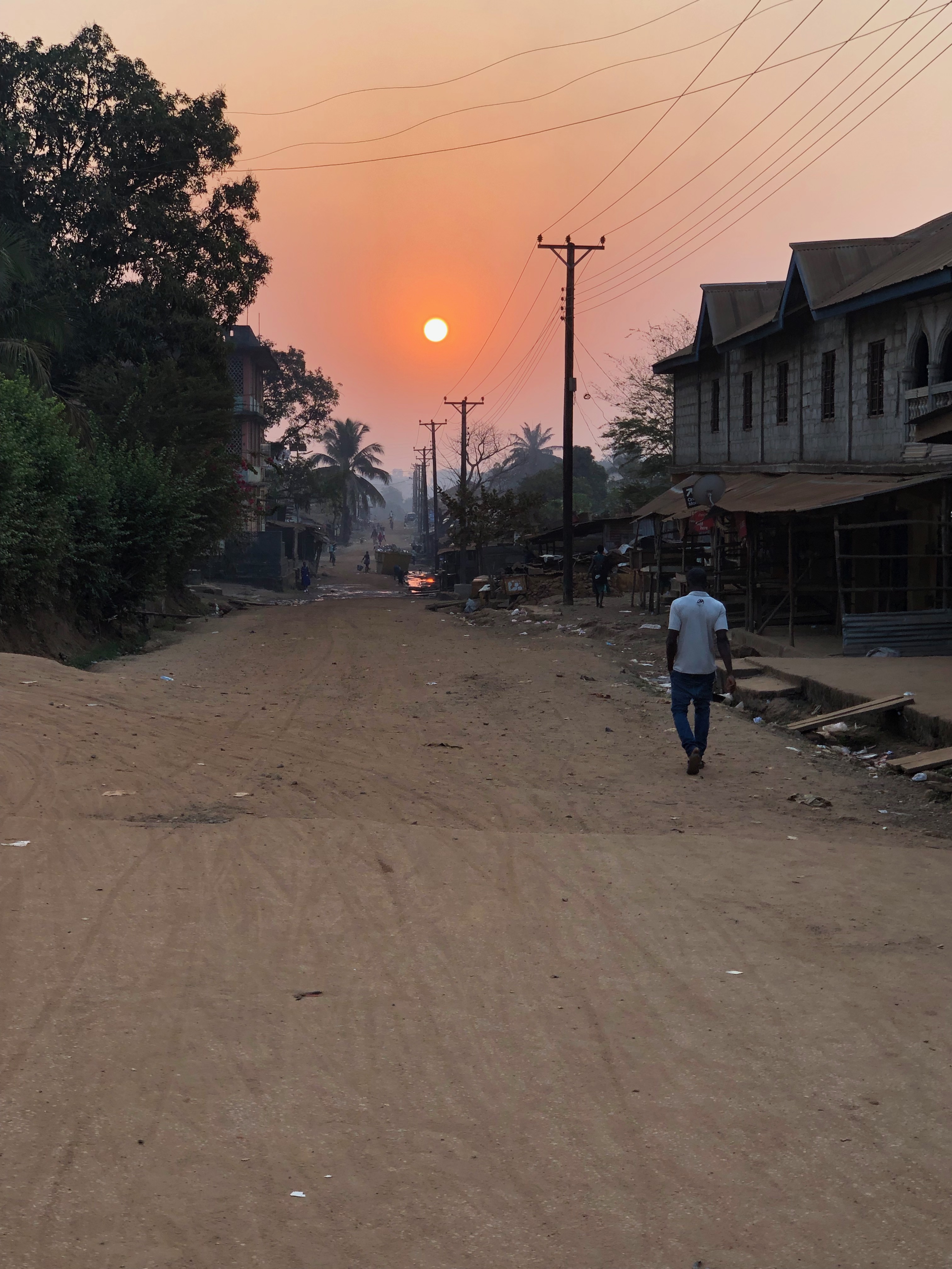On Thursday morning, LaDawn and I went for a walk and witnessed a beautiful Sunrise. The dust and fog in the air blocked much of the sun, leaving a bright red ball in the sky that was perfect for picture taking. Here is a picture looking down Jenneh Street to the East. The Harmattan dust has been pretty thick this last week, and very visible in the morning hours.