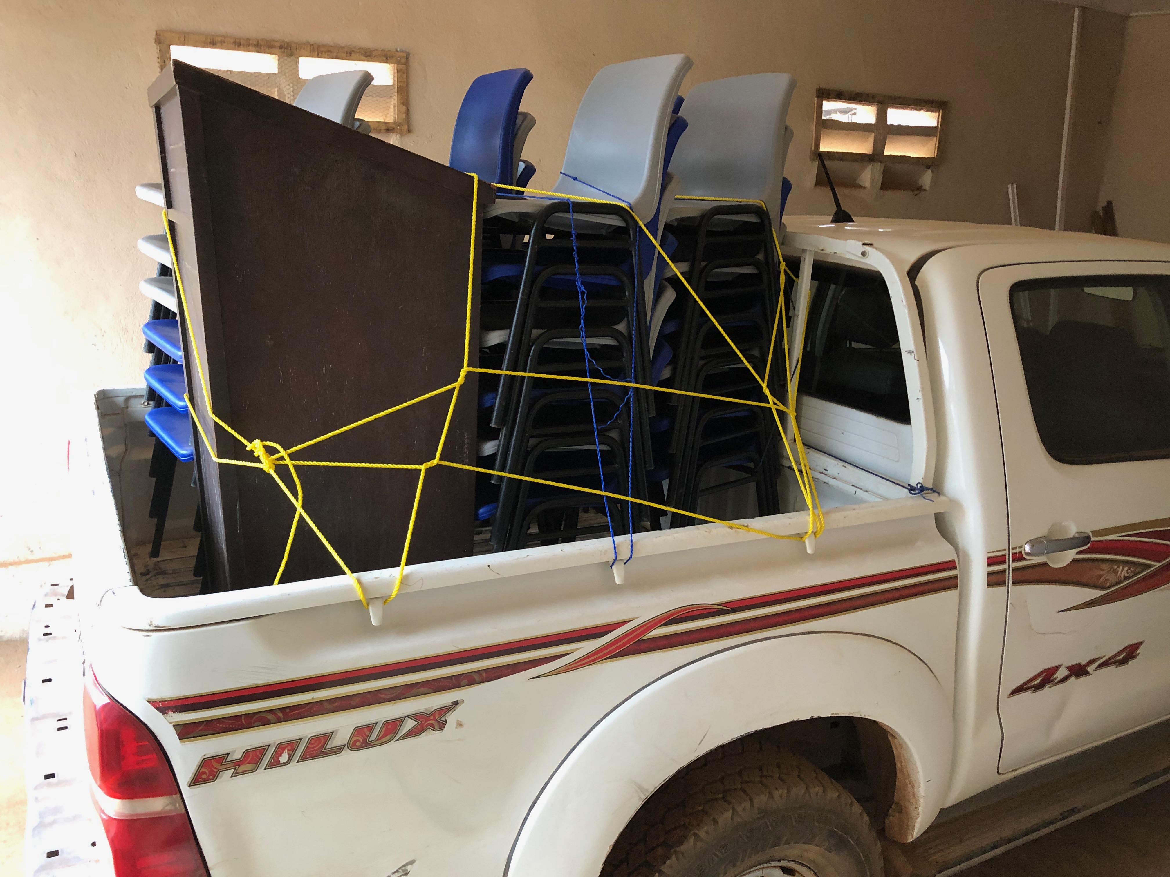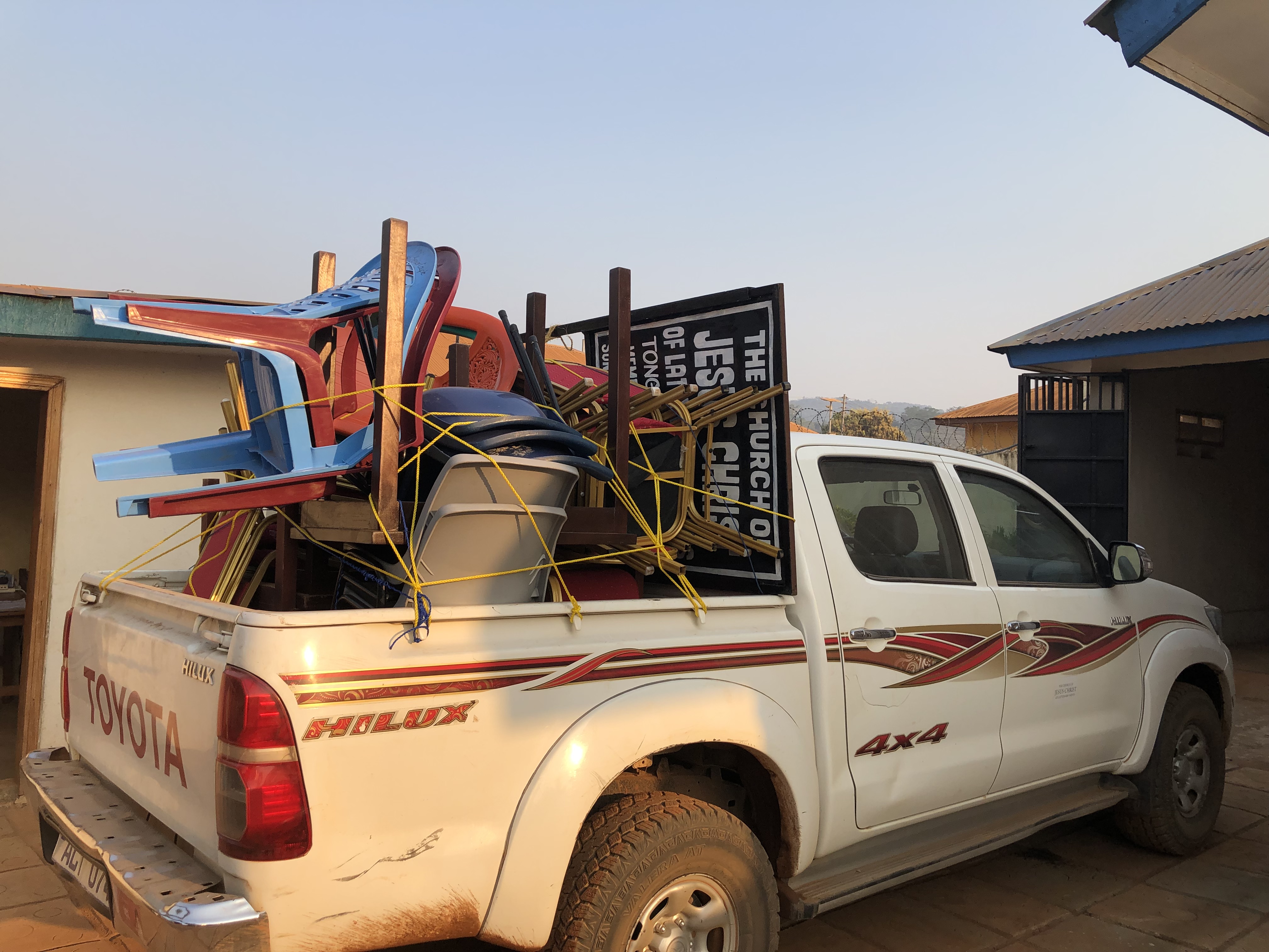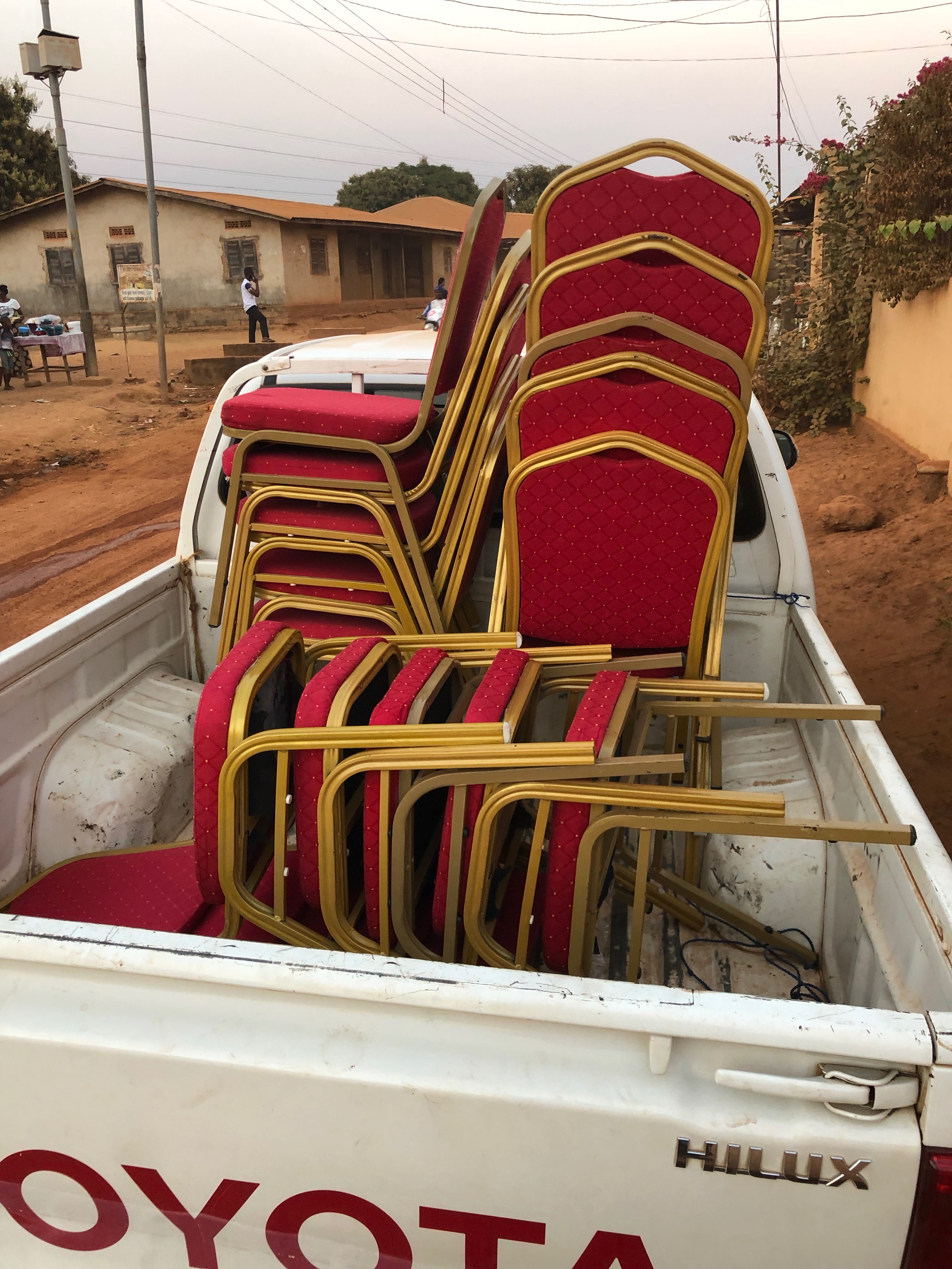 He also painted over all of the rust spots and made it look really great.  We had also been back to Dauda Town and brought 5 more old chairs, a desk and two tables.  We then picked up 15 more chairs (these were padded) from Nyandeyama.  So now with 20 chairs, a desk, two tables and a signpost we weren’t sure if we could fit it all in the back of the truck. We again waited for Charles to come on shift and then watched him work his magic. He did another great job!  We felt like we had our own poda-poda (see last week’s post).