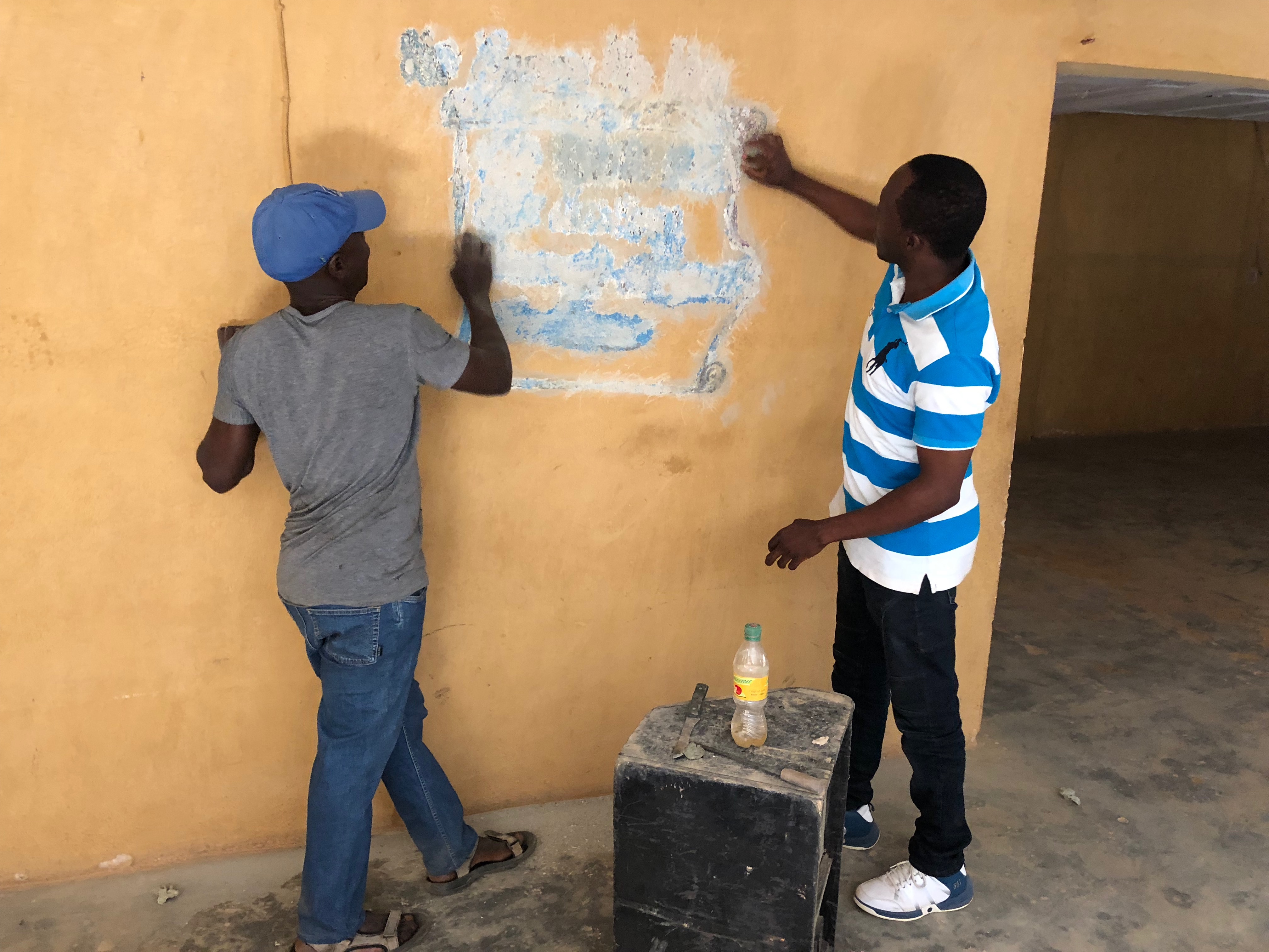 President Cobinah (right) helps scape a “Winners Chapel” logo off a wall using a rock and some gasoline