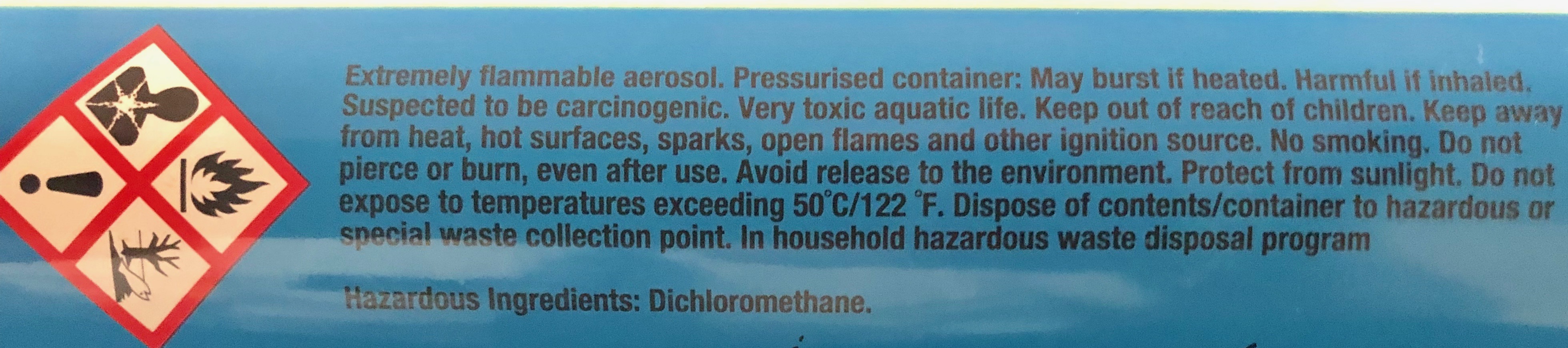 It is Dichloromethane.  A suspected carcinogen and known eye irritant.  In one paragraph on the can it says it is non-toxic, and in another it says it is hazardous and the can must be disposed of as hazardous waste (as if that were an option here).