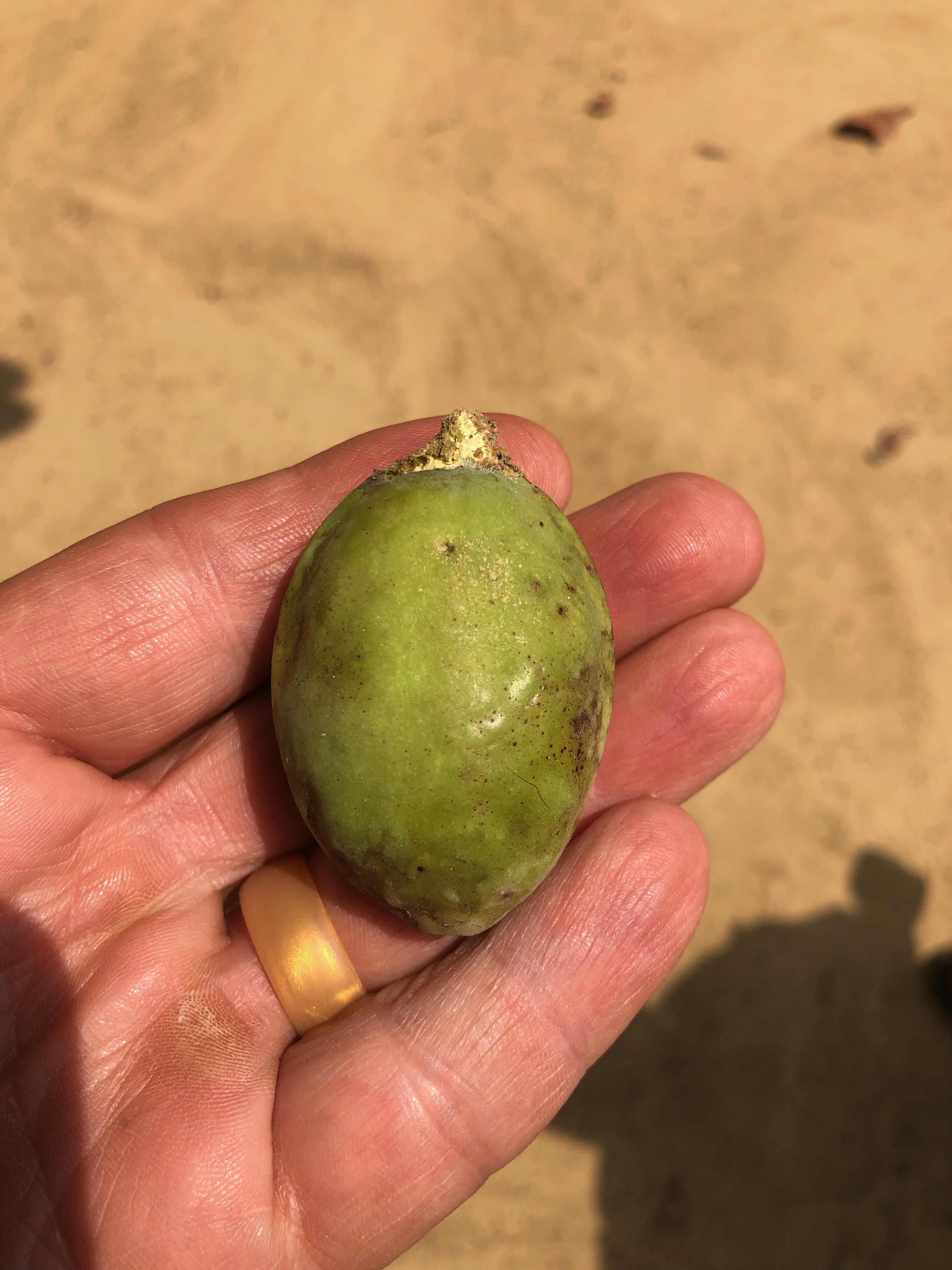On the way home we stopped in Blama and visited with the Paramount Chief as mentioned above.  In Blama there is a beautiful orchard of Palm Oil trees that the Catholic Mission planted many years ago.  There is also a church there that is over 100 years old as Blama was an early Catholic mission established by Bishop John O’Gorman in the early 1900’s.  The area around the Catholic Mission can only be described as beautiful and peaceful.  There are small plots of gardens that the church allows the people to garden, there is a big secondary school and of course the palm oil trees.  One of our favorite places so far that we have visited. While we were there we noticed a big beautiful tree in front of one of the church buildings.  When I asked Junior what it was he said it was a ground-nut tree.  He found a pod that had fallen from the tree, broke it open and inside was a small delicious, almond-like nut.  I have tried to find the actual name of this tree but to no avail.  Ground nuts here are peanuts, and this is not a peanut.  I will continue to pursue this mystery!