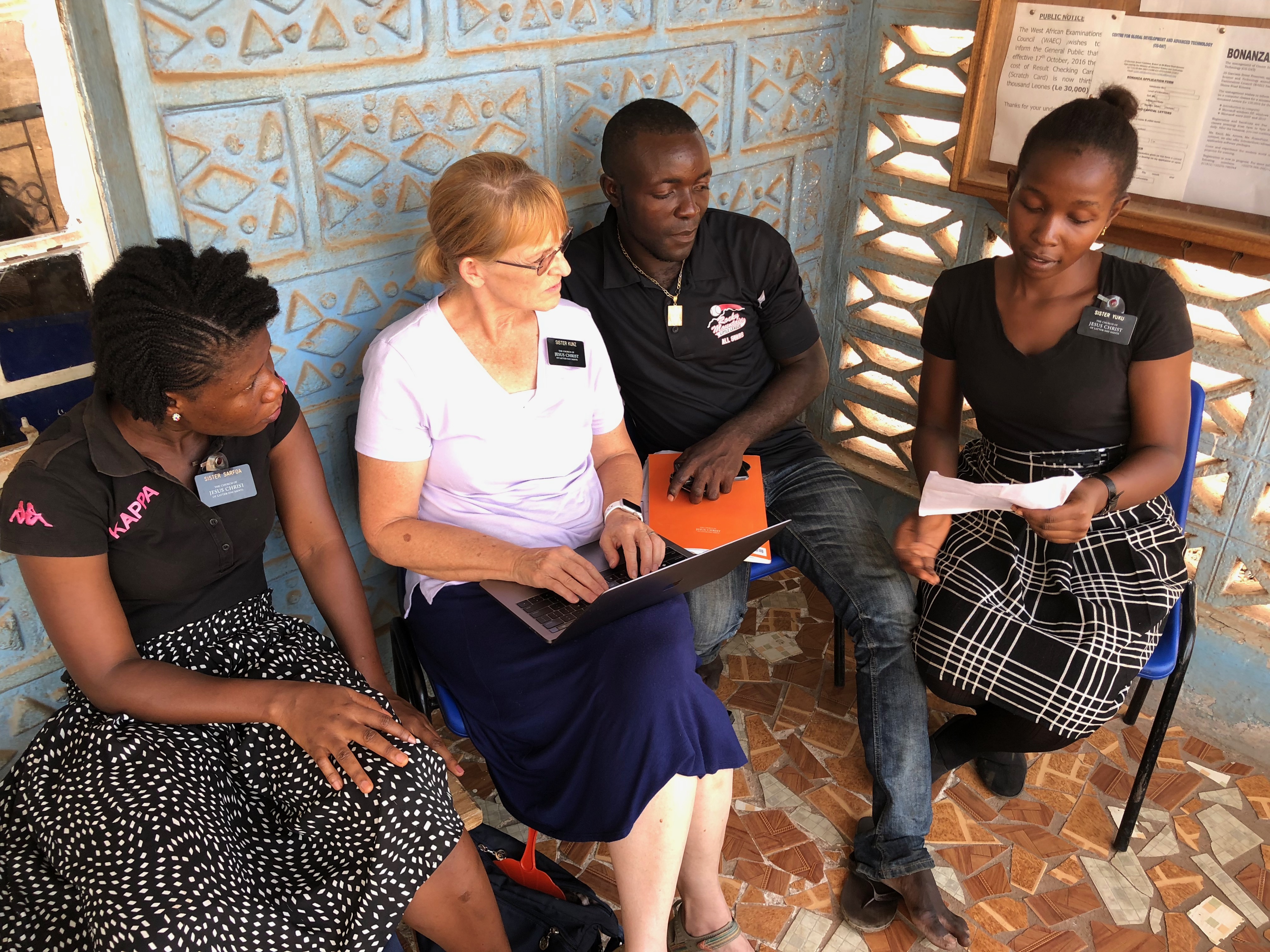 Family History work with Keifala (left) and Ibrahim (right). Sister Blama-Kai (blue) and Sister Kisangala (pink) are helping calculate dates