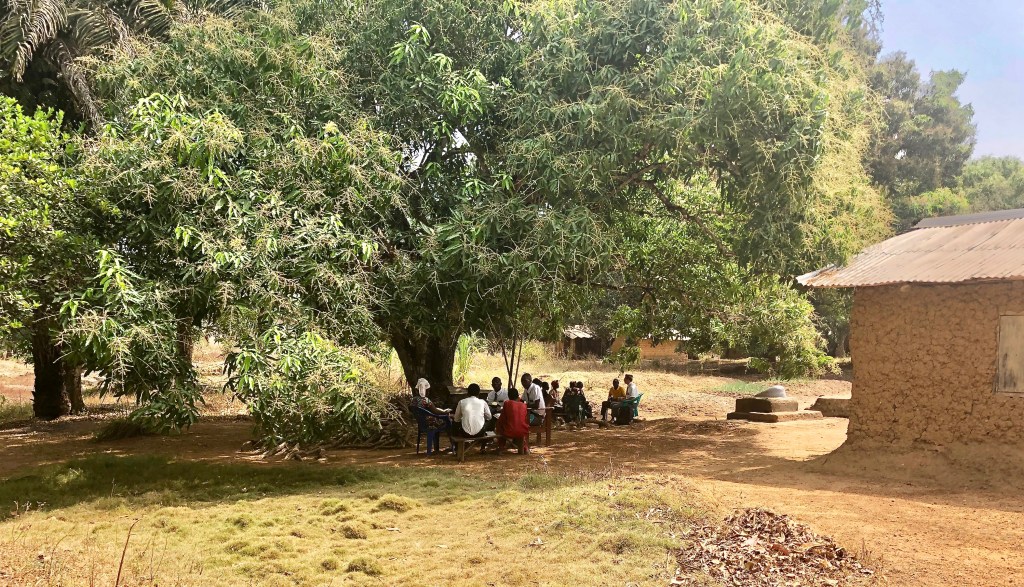 Teaching John, Rebekah Grace, Konowa, Lasana, Kadie, Mary and Ibrahim under the Mango Tree
