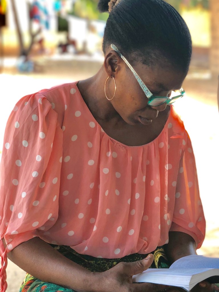 Hannah Braima reading from the Book of Mormon with her new glasses