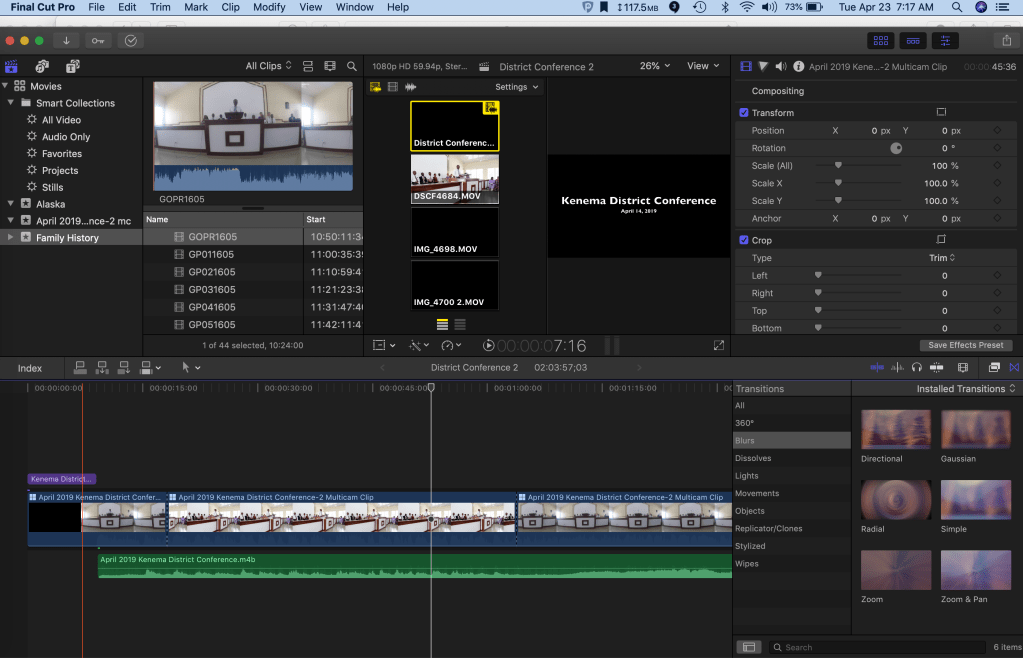 That sent us back to the internet for more searching. We ran across several references to a program called Pluraleyes which seemed to have a good reputation for doing exactly what we needed to do. Fortunate for us they have a 30 day full-feature trial on the software (otherwise it is $400). It worked perfectly! We have to say we were impressed with the results. It even accounted for the audio drift (still not sure how it did that!). Once we figured this out we were able to make the video and add in a title, name titles for the speakers, and a full length intermediate hymn (We had to turn off the GoPro during the actual intermediate hymn to change the SD cards).