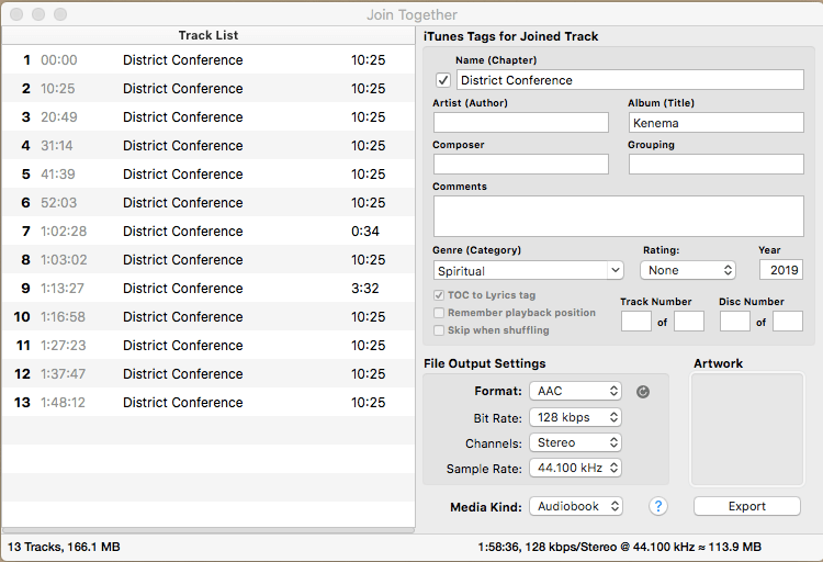 program (Join Together) on LaDawn’s laptop to stitch together a bunch of mp3 files into one single m4b audio book file. We used iTunes to convert the m4b back to one mp3 file. Now we had one solid audio file of the conference.