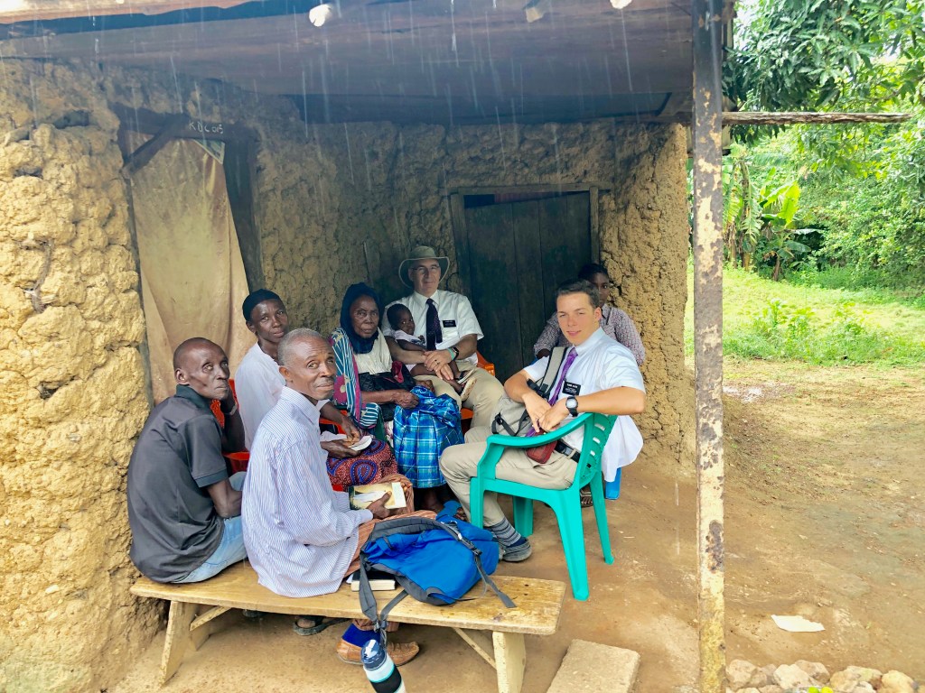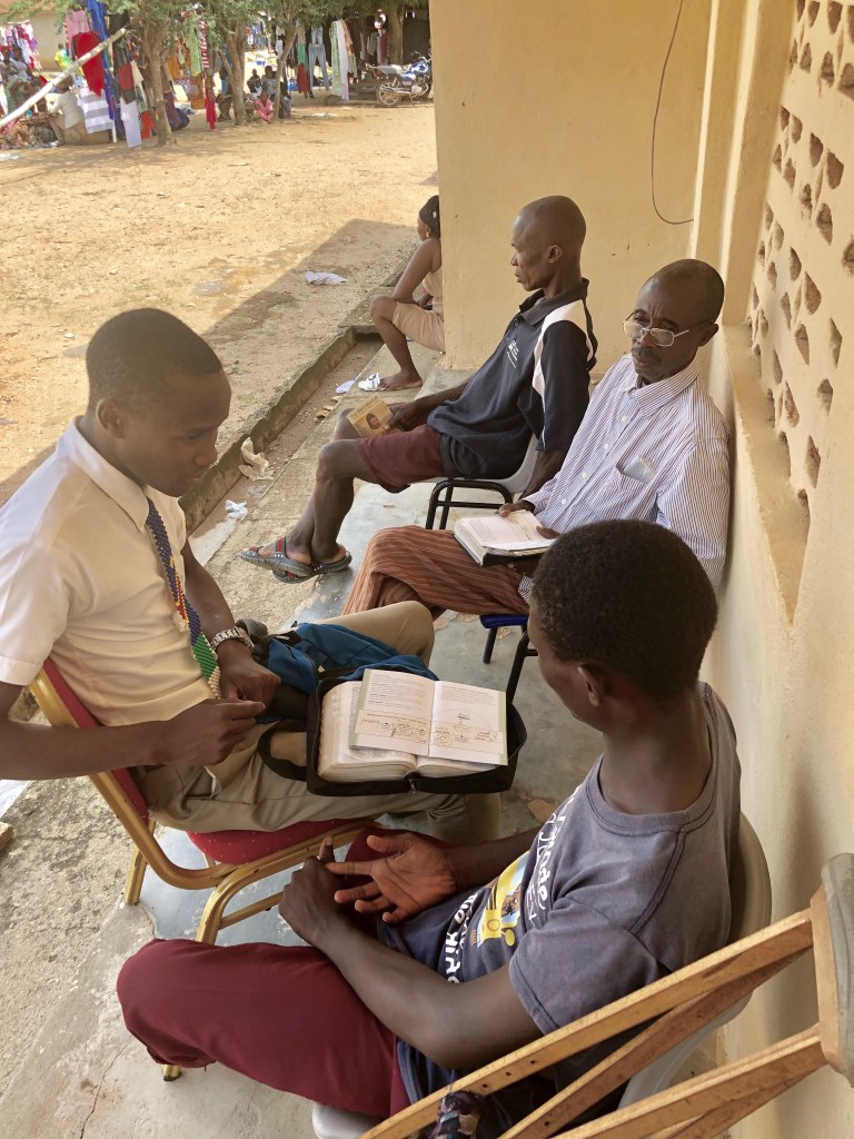 Elder Allen teaching Ibrahim (next to Elder Allen). Sahr and his son Daniel are on the right side