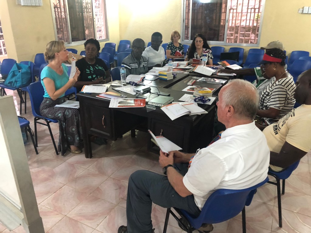 At 3:00 pm we arrived at the Messima Branch building where teacher training was held for members of the Bo East District. It had been raining and that always puts a damper on attendance, but by 4:30 pm, there were 5 teachers there, plus the district literacy specialist Amie Kemokai, with whom we were especially impressed. She did a masterful job leading much of the training. This is exactly what it takes to make Gospel Literacy a success and we were so happy to see it happening.