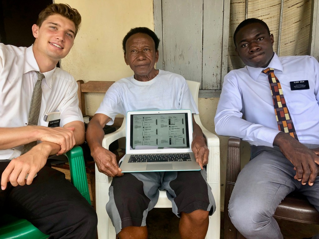 Right after noon, we walked over to the Sister’s apartment and delivered their well-earned Chocolate Chip Cookies. We also took a plate to Airfield Apartment, where we picked up Elder Rydjeski and Elder Edun and drove over to Junisa Alfred Korma’s home where the Elders helped him to input his family history into FamilySearch.