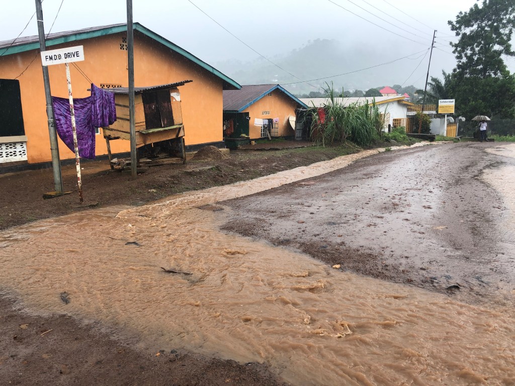 When it rains here the water finds the path of least resistance.  On the paved roads (about 5% in distance of all roads in Kenema), the water runs to the side and into concrete ditches that carry it away.