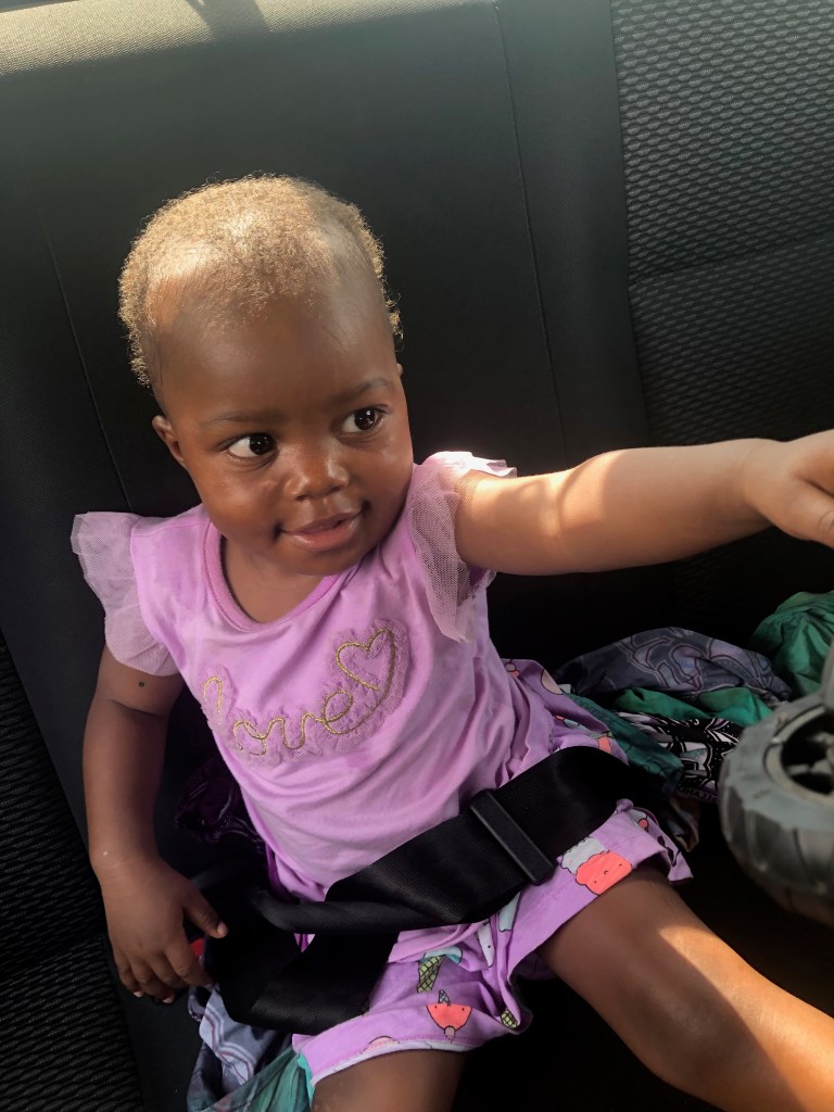 As we were still about 2 hours away from Kenema, we stopped for a bathroom break.  The way this works is we pull off the road near a home.  Rebecca asks them if she can use their “facilities”, they say “yes”, and we wait.  While she was gone, Grace tried to put her seatbelt on.  According to Lisa she was not happy with the car seat in America when she first had to sit in it and be belted in, but this little girl is a very quick learner.  While we were stopped, LaDawn put the adult seat belt around her waist and she happily sat in it the rest of the way home.