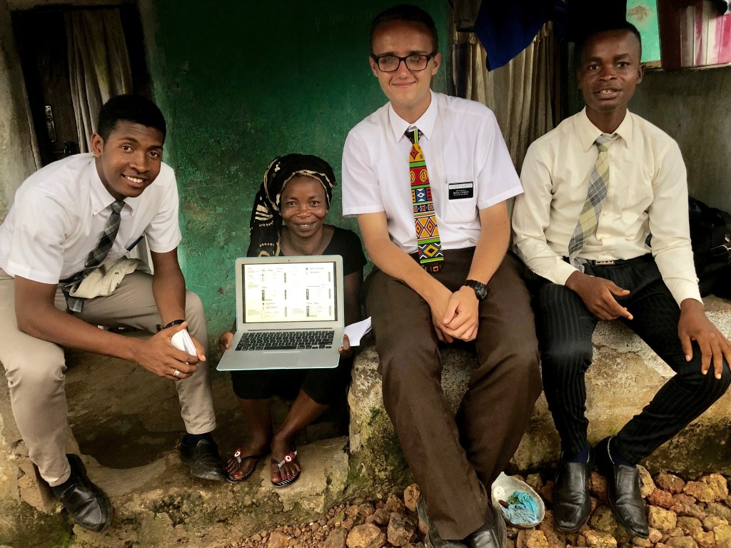 After the video conference we traveled to the Kenema Central branch area where we met Elder Fajardo and Elder Tovomaro to do some family history. Bondu Kange has been a member of the church since 2011. Both her father and her grandfather were paramount chiefs. Both had as many as 7 wives. Because of this lineage, good solid family information was available to her. She had her entire four generations filled out on a pedigree chart that the Elders helped to input into FamilySearch. There is so much more work that she needs to do with that sort of family history, but what a tremendous start she has made in the work! Kudos to her son Samuel who helped her to write it all down so it could be entered in the system.
