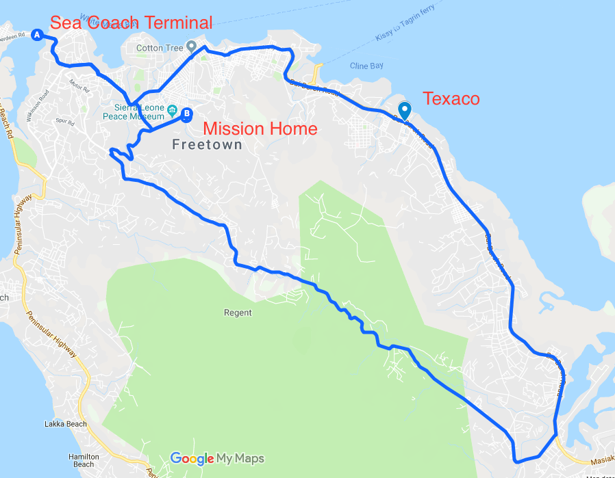 LaDawn had gone into the terminal to meet her while I parked out on the street.  We had never seen the terminal so full of people!  Fortunately, by the time they were ready to be picked up, enough cars had cleared out so that I could get down to where they were waiting.  By 7:30 pm we were in the car and on our way to Paul’s home (her brother in law) in Kissy.  Fortunately, it was a Sunday night, but the traffic was still heavier than we thought it should have been.  Driving narrow streets in the dark with hundreds of people walking on the sides of the roads competing for the right of way with trucks, vans and motorcycles sharing a road hardly wide enough for one-way traffic let alone a two-way flow.