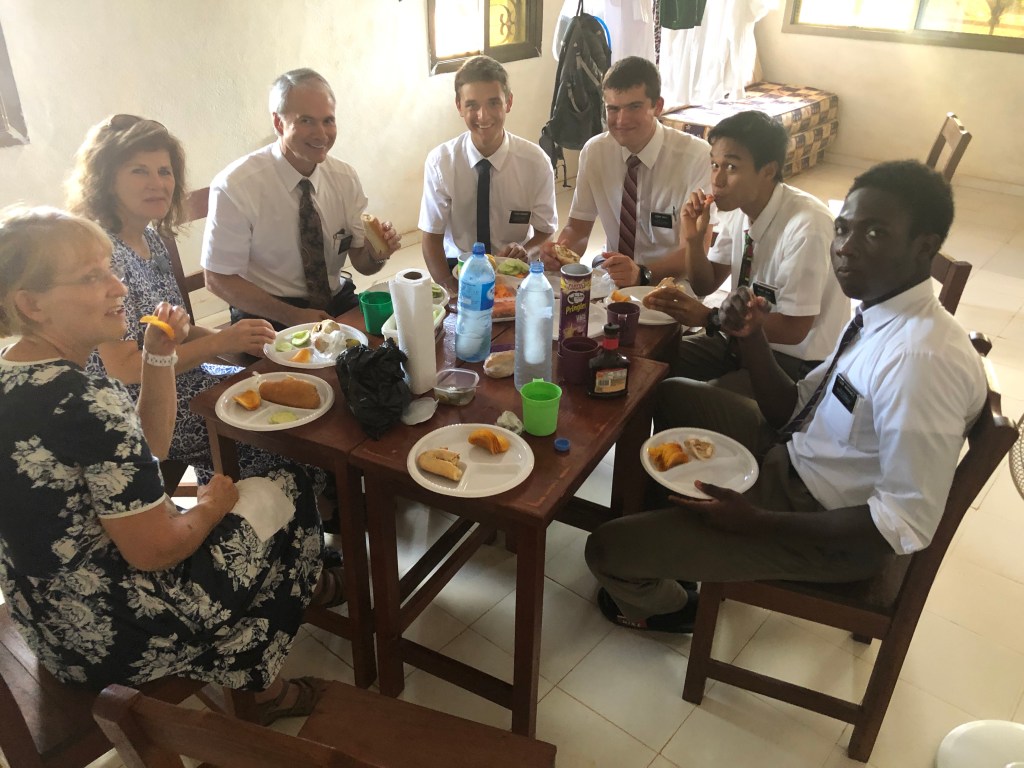 After the district council President and Sister Harper went first with Elder Nwangele and Elder Abad to visit a young woman they have been teaching and then they went with Elder Shill and Elder Wagner to visit the “chief of police” in Kailahun with whom they have been meeting. Both sets of missionaries and the Harpers had great experiences. When they were finished with the appointments, we drove over to the missionaries apartment and had lunch together. LaDawn had made some delicious chicken sandwiches and we brought some Pringles, pickles, carrot sticks, cucumber slices and barbecue sauce (for the sandwiches). It was like a family picnic indoors! We had the opportunity to sing happy birthday to Elder Shill, which he thoroughly enjoyed. We suggested to President & Sister Harper that they should have a birthday meal with every one of the 166 missionaries currently serving! :-) Unfortunately, the drive back was not nearly as pleasant as the drive up as we ran into quite the rainstorm halfway between Kailahun and Pendembu. We were grateful to make it safely back to our apartment and then enjoy a delicious spaghetti dinner that LaDawn had prepared.