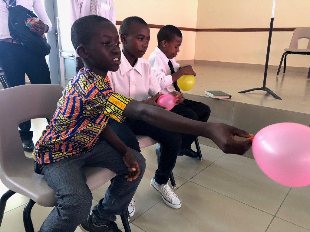Near the end of the program, 12 boys were able to participate in an hilarious balloon game. Three boys on one side blew the balloons up and the three on the other side had to retrieve them and then sit on them with enough force to pop them. It was especially funny when the boys could simply not get the balloon to pop. We all had good fun with the game.