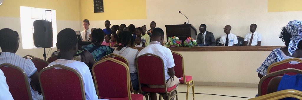 Before completing her mission, Sister Akwara (full-time missionary) had done some amazing work in helping to prepare them. Where she left off, Elder Jardine jumped in and picked it up. He played the piano for them and gently helped them to stay on track. Sister Sesay, the counselor in the Primary was also on the rostrum helping them as they came up and said their part. It was a tender and sweet sacrament meeting to see these children share their testimonies in both word and song. At the end there was some time left, so President Fomba spent a few minutes talking about missionary work, about teaching our children at home and about being reverent in sacrament meeting. All in all a great meeting.