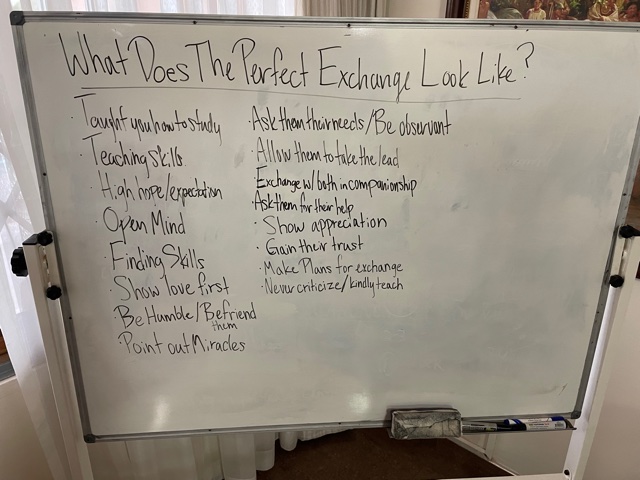 The meeting started with a beautiful opening hymn. We sang “I Need Thee Every Hour”, it was an amazing moment as the spirit bore witness to each of us that we were engaged in the cause of Christ. We then talked about our upcoming zone conference schedule, a new course on the Edify App titled, “Safeguards for Using Technology”, and the baptismal record problem mentioned above. We also talked about the process for getting medical care. We have first aid kits in all the apartments that are only to be used with the approval of the mission nurse (that’s LaDawn right now). We have had some trouble with missionaries always following that particular guideline, so we were going over the process for getting medical care spelled out in the relatively new Missionary Standards for Disciples of Jesus Christ handbook. We were surprised at some of the pushback we received, but we pressed on, next talking about Accountability. Accountability is the term we use to discuss how well we are doing against our goals (and thus the late night on Wednesday learning about the numbers). Following that discussion, the Assistants did a brainstorm session on “The Perfect Exchange”.