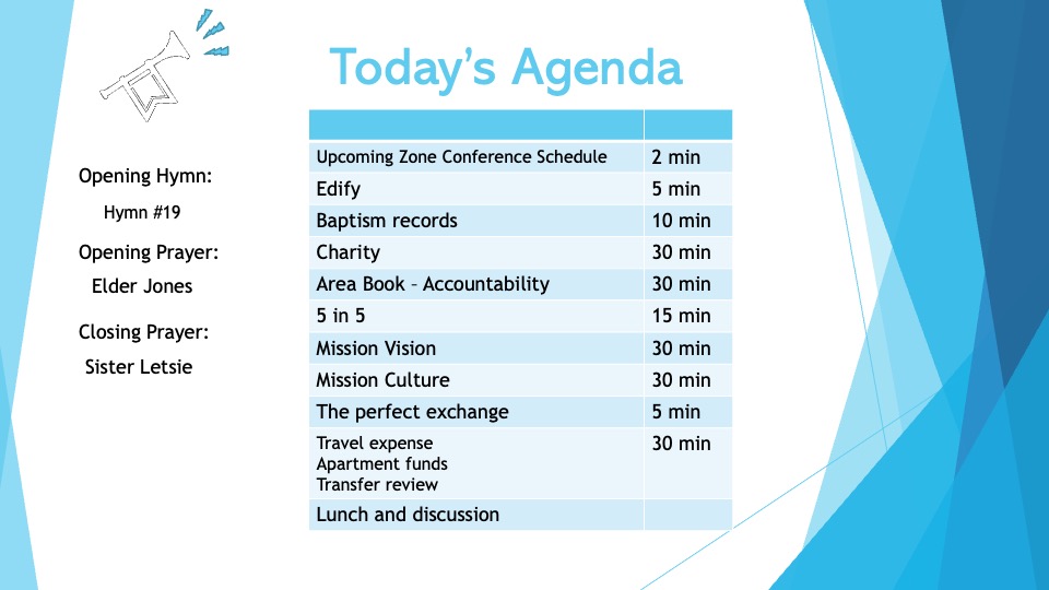 Next we talked about the vision that the MLC has for the mission. At the very first MLC after we arrived, we began the discussion, but last time did not get that far in the meeting before we had to stop. This time, the discussion was brilliant. I put the original vision statements up on a slide and then showed them the categorization that a friend back home had come up with. There were two categories: 1) Missionaries as Disciples and 2) Establishing Zion. I asked them to look over the statements and tell me if there was anything they would change. I think we ended up changing or deleting 3 items. My favorite was the suggestion to move away from “#1 priority is proselyting” to “#1 priority is bringing people to Christ”.