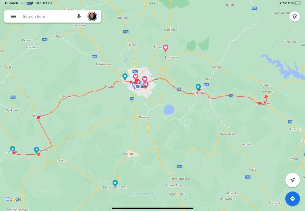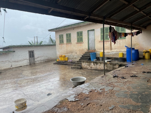 We left Mpraeso at 2 pm and drove to Konongo where we interviewed the Sisters who serve in the Patriensa and Low Cost branches. The rain and the walk had put us about 30 minutes behind schedule but we managed to get there, do the interviews and leave by about 4:15 pm. The sisters apartment needs some work on the outside (already scheduled) but the inside is very nice. LaDawn stayed inside with the sisters while I interviewed each one of them outside under a “patio cover” of sorts. These are some terrific sister missionaries!
