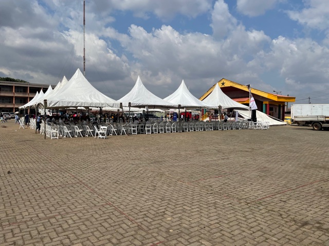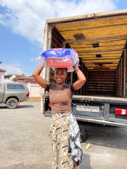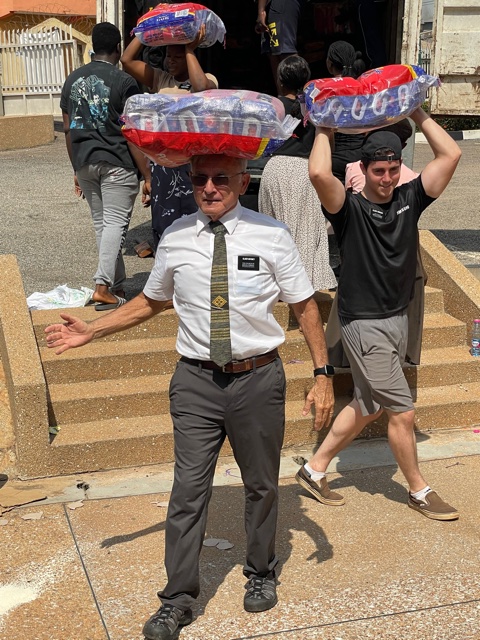On Saturday, the actual event was held at Jubilee Park. It is more of a car park than a traditional park. It was all cement with a small pavilion, perfect for the setting. Church Communications from Accra who did the leg work to get it all organized did a great job. Elder and Sister Kacher from the Area Presidency attended the event and spoke along with a number of other dignitaries from Kumasi. The majority of people who were to receive the bags were also in attendance. We had been asked to invite the 40 families nominated by the missionaries, but most had no means to be able to come to the event, so Elder Moomey accepted the assignment to work with the missionaries to get the bags delivered. It was quite the effort and we are grateful for his willingness to organize and oversee the work. Each of these bags weighed around 50 pounds, and it was quite impressive to see many of these women put these heavy bags on their heads and walk away.