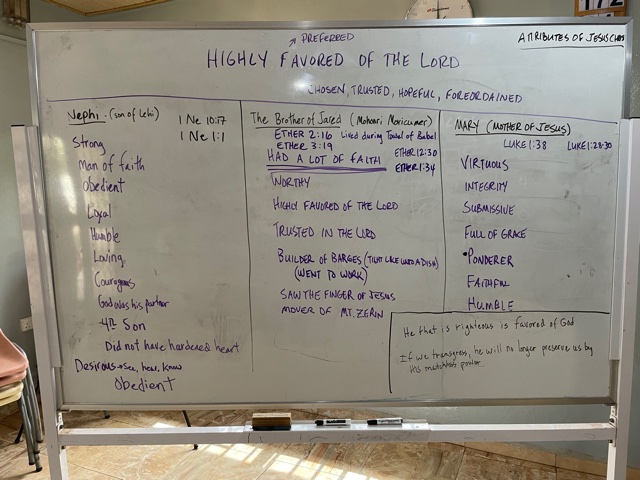 Next up was LaDawn. She spoke about becoming Highly Favored of the Lord. Using Nephi (son of Lehi), the Brother of Jared, and Mary the mother of Jesus, she invited the missionaries to discuss their insights as to the attributes that each of these individuals possessed. She asked them what did they have in common and then encouraged the missionaries to also become highly favored of the Lord.