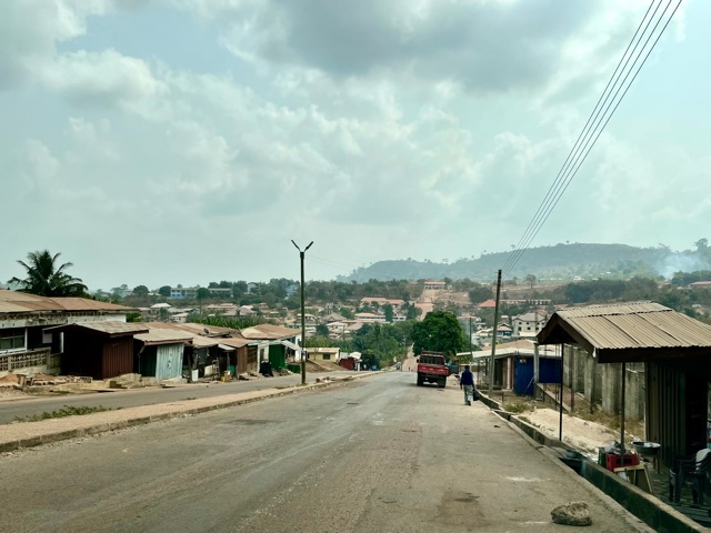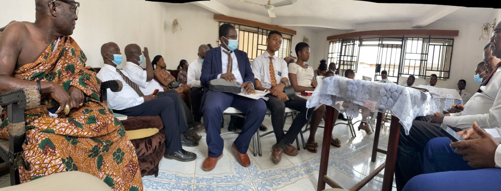 On Sunday we drove out to Agogo to attend the first ever meeting of the Agogo group that was authorized in 2021 while President & Sister Webster were still here. Because of covid, the group was never able to meet and Sunday was the official start. President Boakye, the first counselor in the Konongo Stake Presidency is married to the daughter of the town chief of a small town outside of Agogo called Hwidiem (I would try to explain the pronounciation, but the “hw” sound just doesn’t exist in English). If you look at the map, inside the circle is a small marker. That was the meeting place on Sunday in this smaller town. Because of the connections to the chief, he arranged for us to have a place to meet and even honored us with his presence.