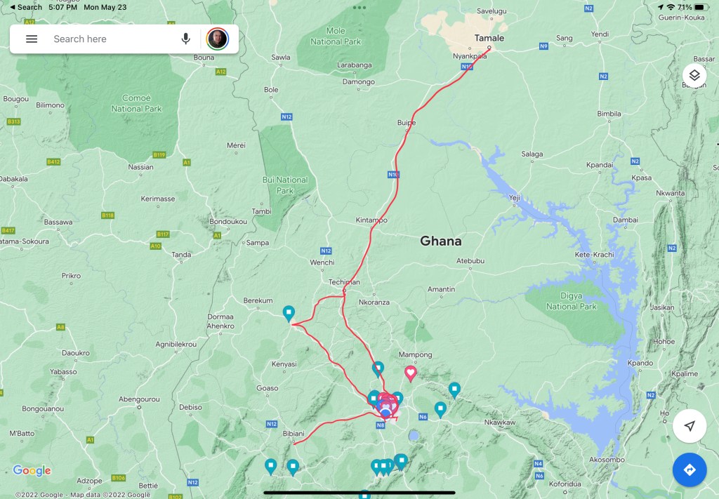 After the Techiman conference on May 15th, we headed north to Tamale for interviews and a zone conference on the 16th and 17th. We then returned to Techiman on the 18th and held interviews with the missionaries there before driving to Sunyani where we stayed the night, had zone conference the next day (May 19th) followed by interviews. We stayed another night and then held the remainder of the interviews on Friday, May 20th before departing for home, arriving around 5 pm. It was good to sleep in our own bed, but then the next morning we left at 6:00 am to drive to Bibiani for their district conference. Last time we had a conference in Bibiani, we drove back and forth both days, but this time we reserved a hotel room and saved the driving time. That was nice after all of the travel over the last week. We returned to Kumasi on Sunday after the last session of the conference, again grateful to be able to sleep in our own bed once again. Total distance? Just over 900 km (560 miles).