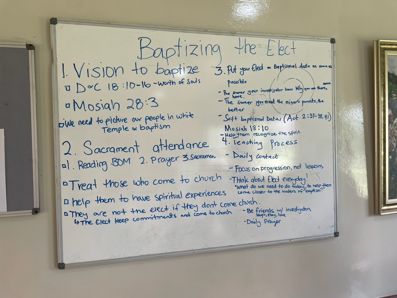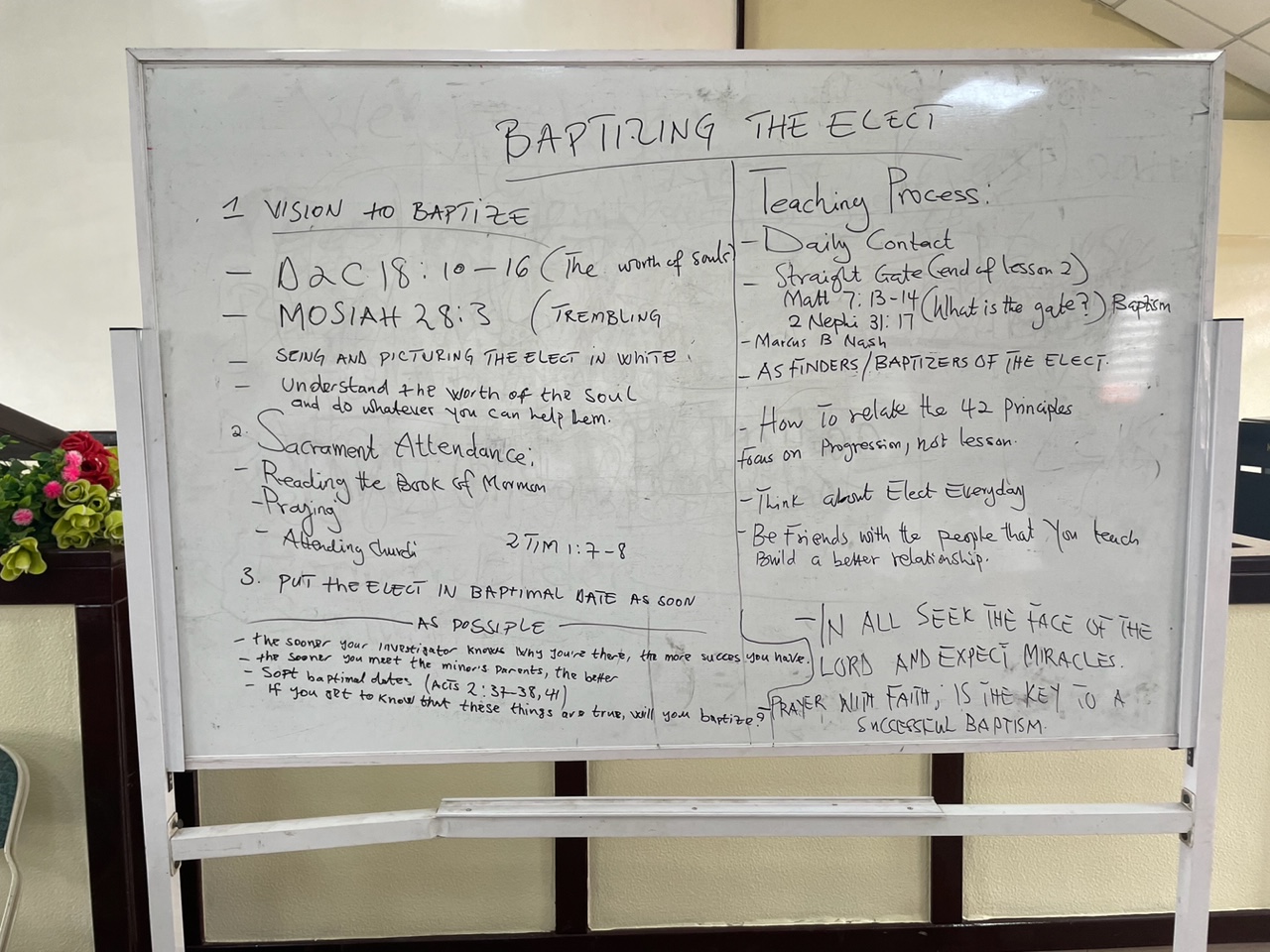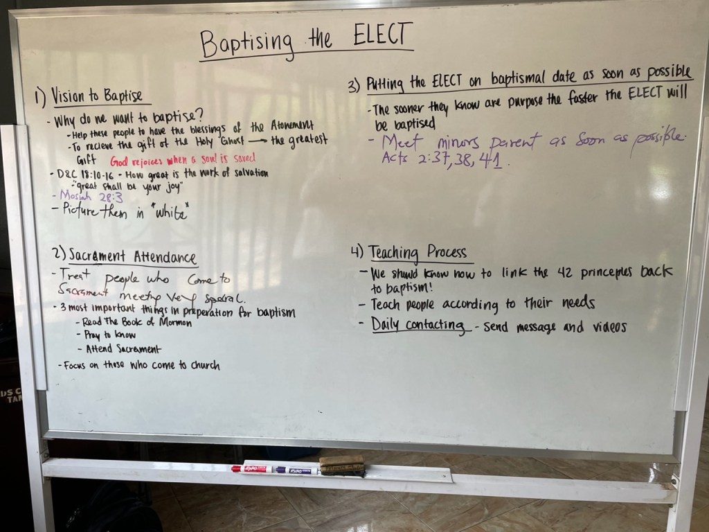 We had the zone leaders in each conference present 4 points on Baptizing the Elect. While all of these principles are in Preach My Gospel, we felt a special need to re-emphasize them here.
