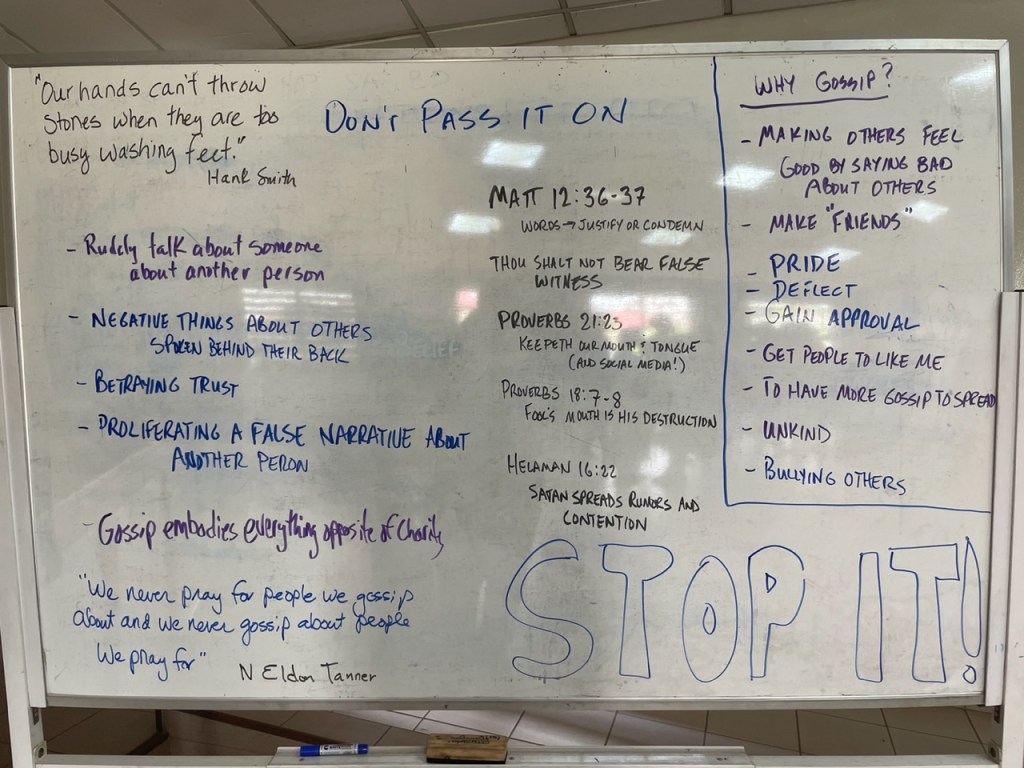 We really hope that the missionaries can catch the vision of discipleship when they DON’T PASS IT ON. It is no fun for any of us to be on the receiving end of gossip, and I think it is fair to say we have all been “that” person at some point in our lives. President Uchtdorf’s counsel from his April 2012 Conference address is perfect. “When it comes to hating, gossiping, ignoring, ridiculing, holding grudges, or wanting to cause harm, please apply the following: