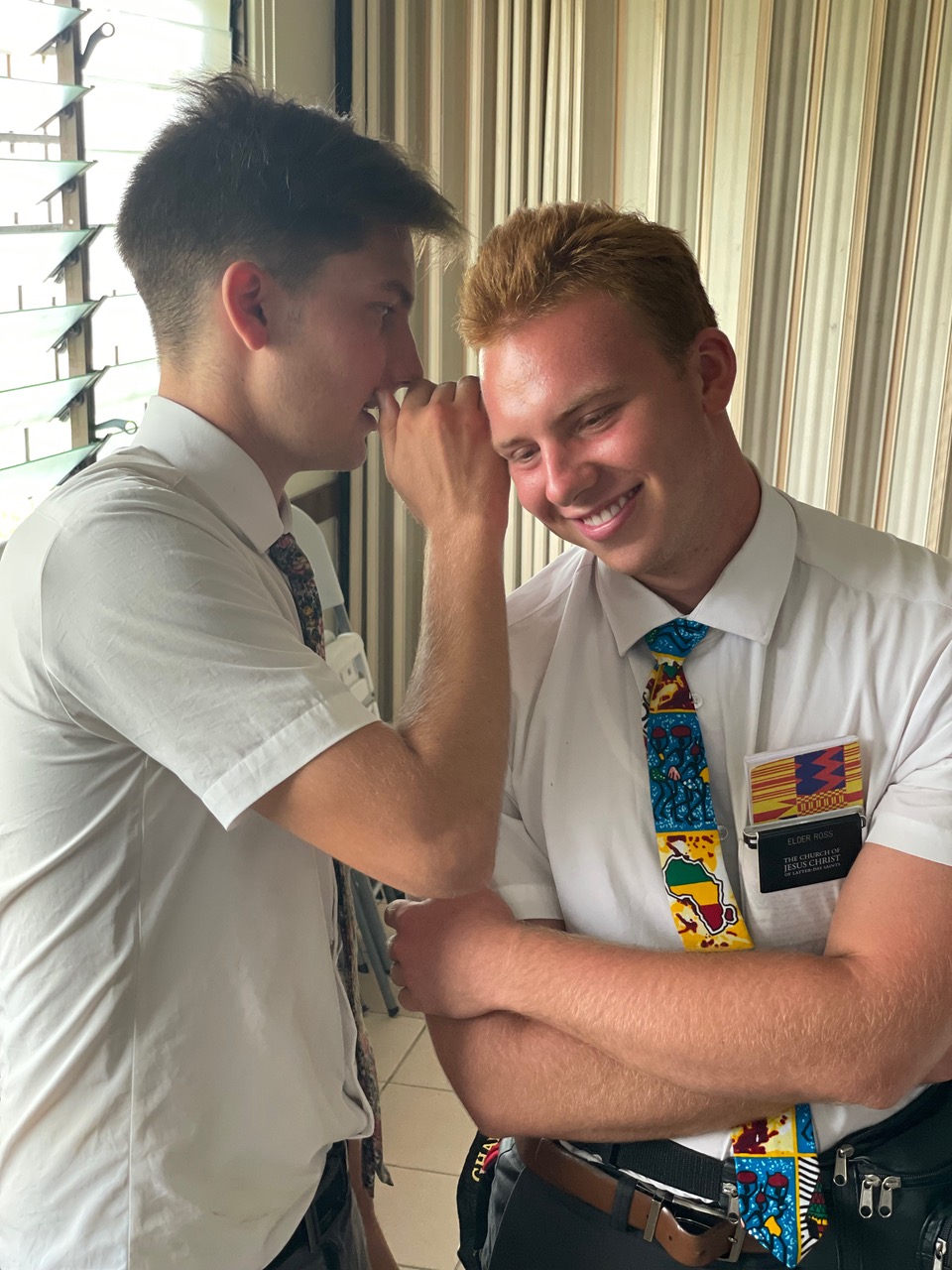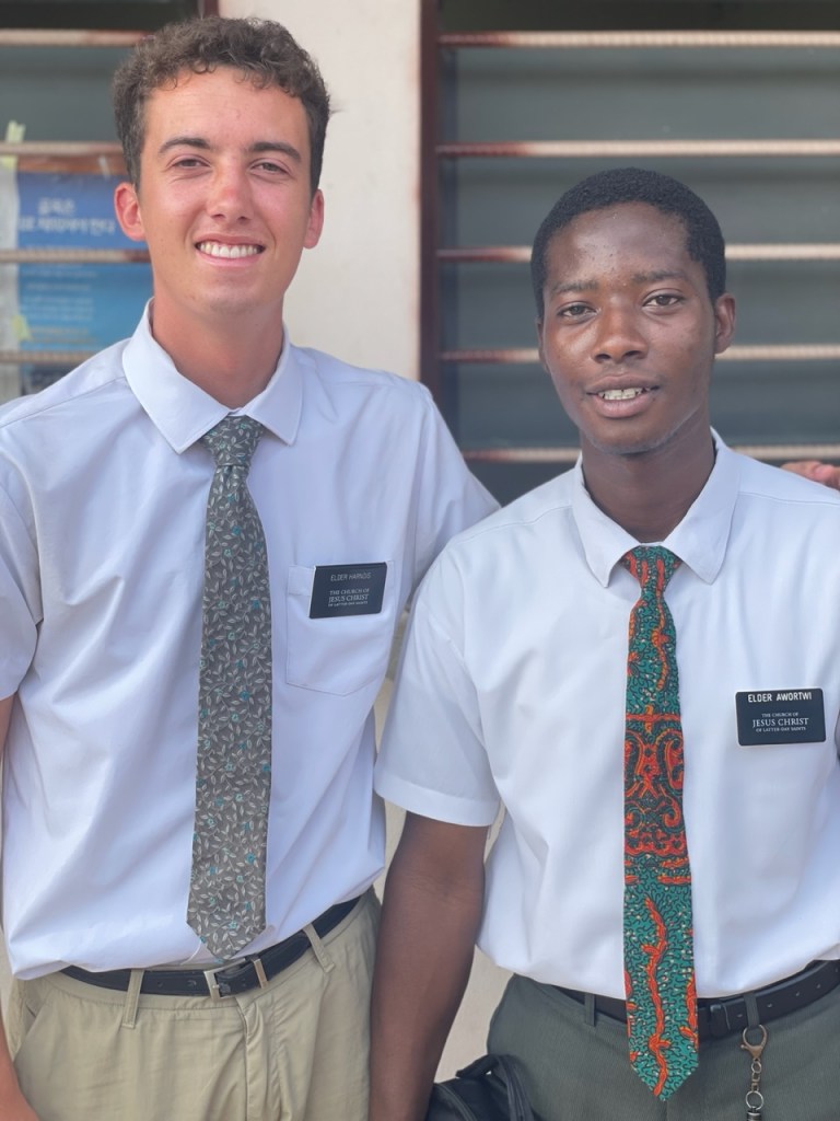 That was our Tuesday, Wednesday, and Thursday….including a presidency meeting on Thursday night. On Friday we did a bunch of interviews for the Dichemso zone and went from 10:00 am to 3:00 pm interviewing 16 missionaries with a short break for lunch (peanut butter and jelly – my favorite!). It was a good day. Unfortunately, we only managed to take a picture of the very last two interviewees – the zone leaders, Elder Harnois and Elder Awortwi.