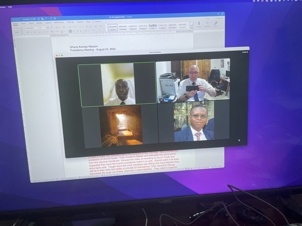 Wednesday evening, I held our mission presidency meeting. Unfortunately, President Obeng’s baby daughter had had surgery that day and he needed to focus on his family, although he popped in and out of the meeting. I am so grateful for these good men who help move the work along in the districts by spending time and effort where I just don’t have the bandwidth to do so. President Obeng, President Asante, Eugene Ghorman (mission clerk) and Elder Garrison (Executive Secretary). Unfortunately I only took a snap after Elder Garrison had already hung up from the call.