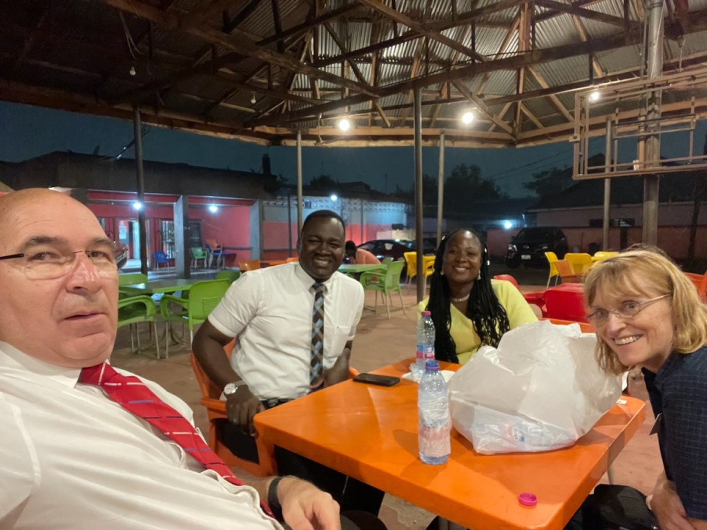 On Friday, evening, we were pleased to host Elder Patrick and Sister Elizabeth Appianti in our home for a visit. We then went over to Piri Piri and in the pounding rain (on the tin roof of an open pavillion) enjoyed a delicious meal together. We are so grateful for the Appianti’s and the time they spent with us Friday evening.