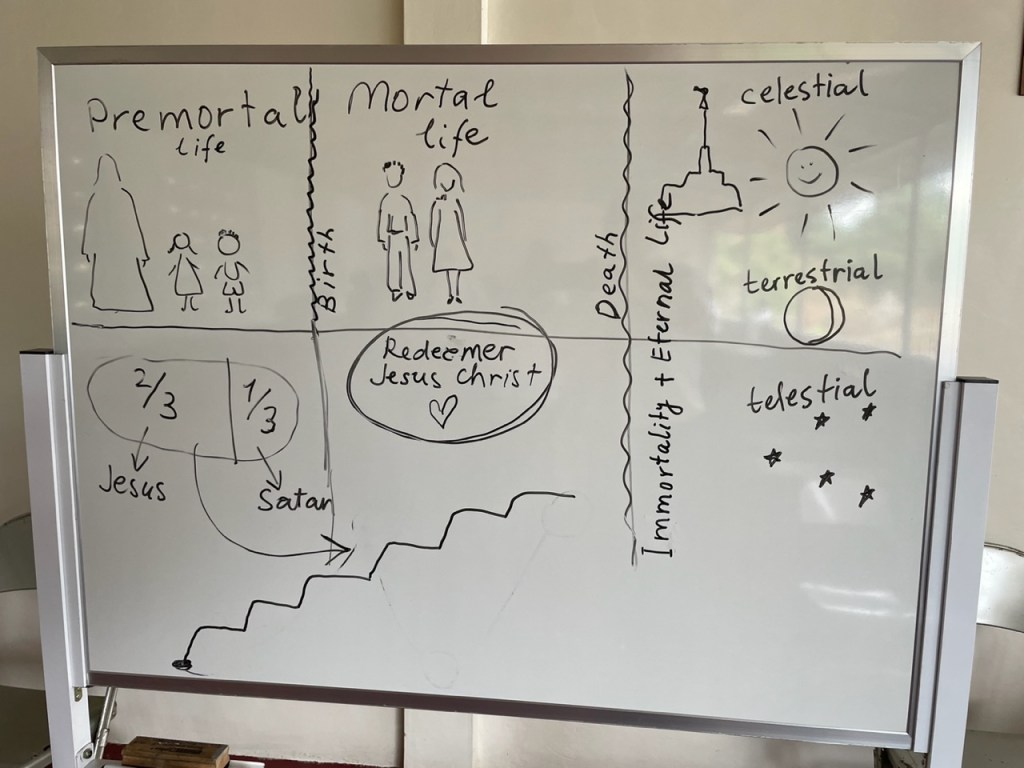 During the second hour, Elder and Sister Klebingat spoke to all of the youth in attendance, about 6-7 of them were non-members. One of the non-members, a 12 year old named Janet, that I met when I went out proselyting with my Assistants, asked a question about the Plan of Salvation and that became the theme for the rest of the meeting. What a glorious meeting it was! Elder Klebingat interacted with the youth as he taught them and Sister Klebingat drew a picture.