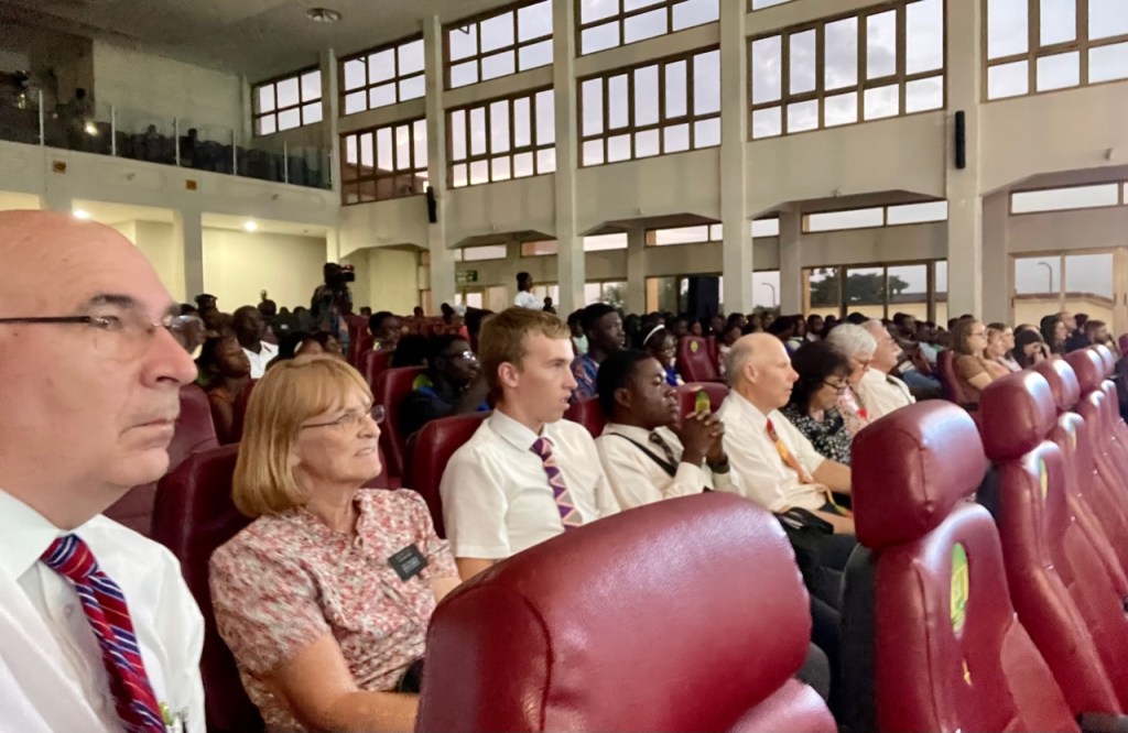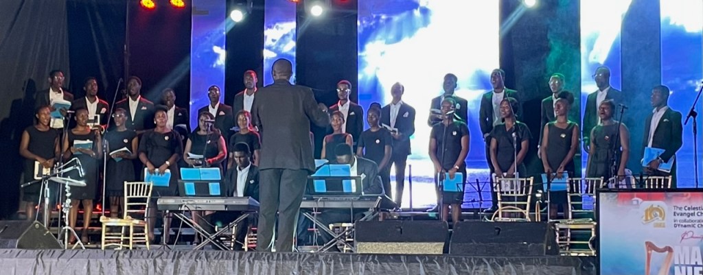 On Saturday night we did something quite rare for us. We went to a choir concert that was sponsored by The Celestial Evangel Choir Ghana. It was to start at 5 pm, but actually got under way about 5:25 pm. It ended about 9:15 pm. There were quite a few choirs who sang, but the highlight was clearly the The Celestial Evangel Choir. Dr. Albert Dua is the “father” of the choir. He is the conductor of the choir, he leads them, he composes music for them, he plays the piano/organ in an amazing way. He has interacted a number of times with the Tabernacle Choir at Temple Square and he really loves the Church and all that it stands for.