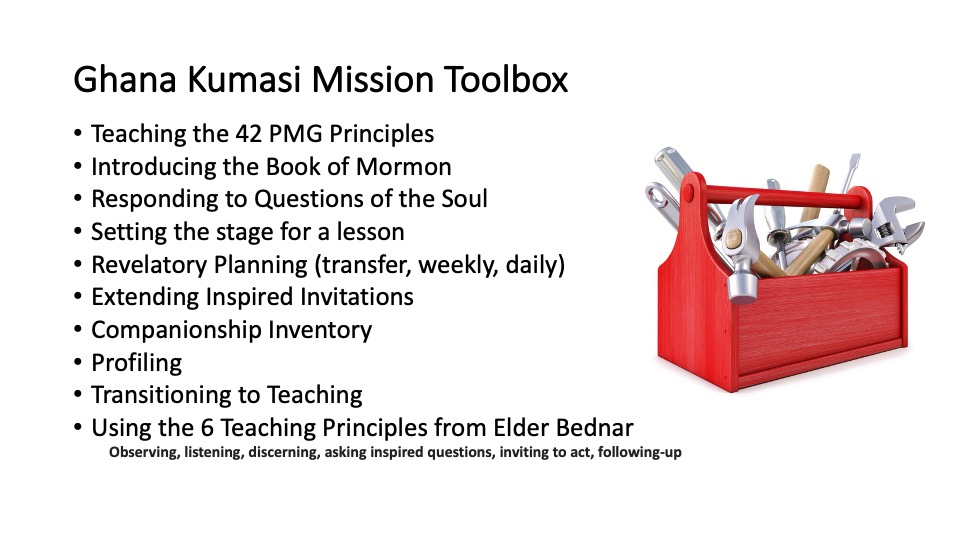 Following the Moomey’s, I shared a new version of the vision. At the Mission Leadership Council the comment was made that if there is a new wind blowing then it seems like the vision should also have some new elements to it. So that is what we have done. The biggest change is making clear that experiencing miracles is about living in the miracle quadrant of high love and high expectations. We have also changed the wording away from “Exact Obedience” and towards “Consecrated Obedience” and living the 17 points. Here is what the revised vision looks like. We will be talking a lot more about this in the days to come. I also introduced the Ghana Kumasi Toolbox. These are the skillsets that we want to get very good at in the coming days. All of our role plays will be based around these 10 “tools”.