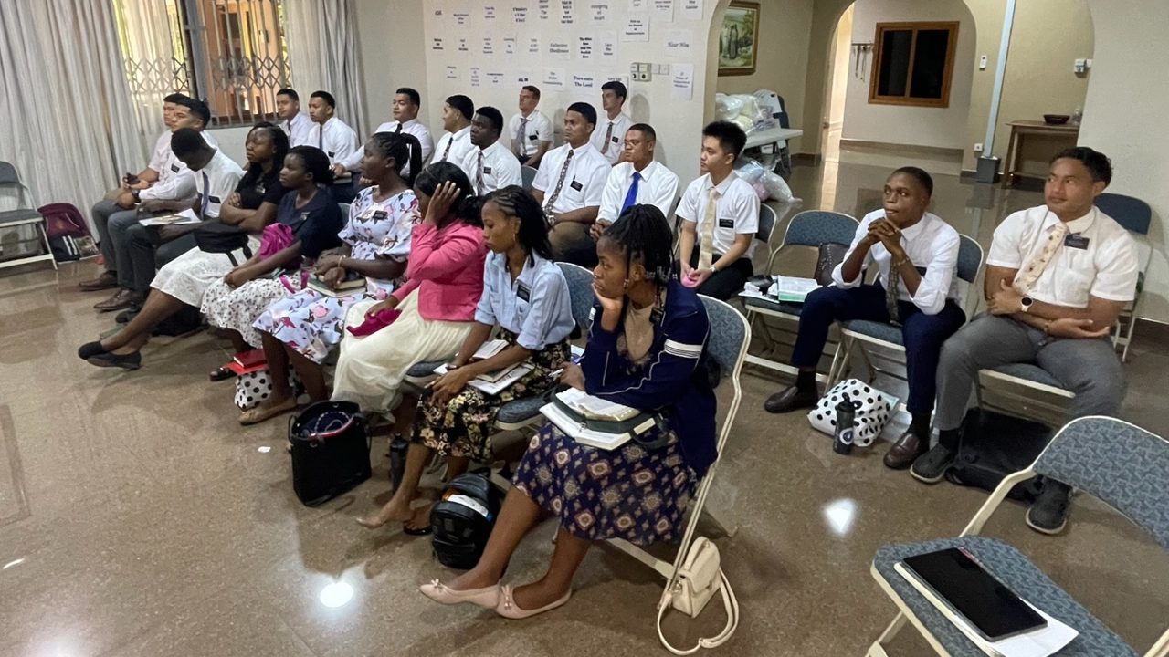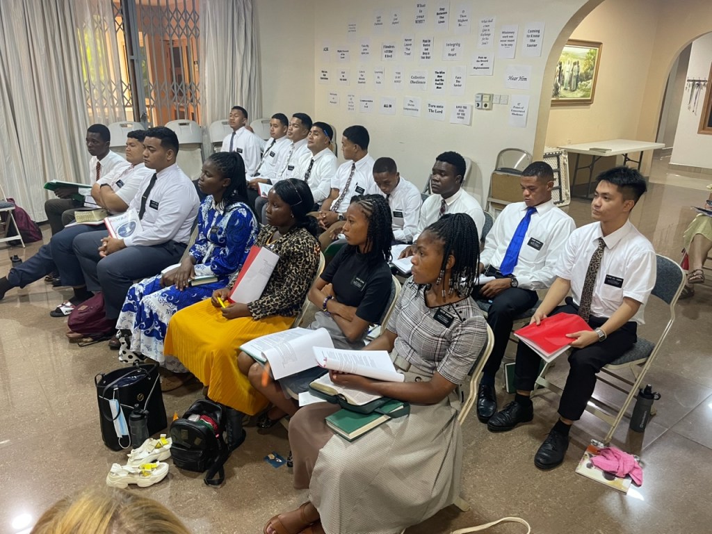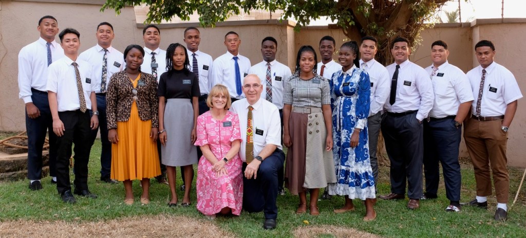 Back: Elder Halahingano (Tonga), Elder Motuliki (Tonga), Elder Polaulu (Tonga), Elder Kangana (DR Congo), Elder Swaray (Liberia), Elder Mbala (DR Congo), Elder Togba (Liberia), Elder Taufu’i (Tonga) , Elder Lose (Tonga), Elder Brown (Tonga), Elder Lui (Tonga). Front: Elder Del Campo (Philippines), Sister Jallah (Liberia), Sister Alfian (Ghana), Sister Zimunhu (Zimbabwe), Sister Enokela (Nigeria)