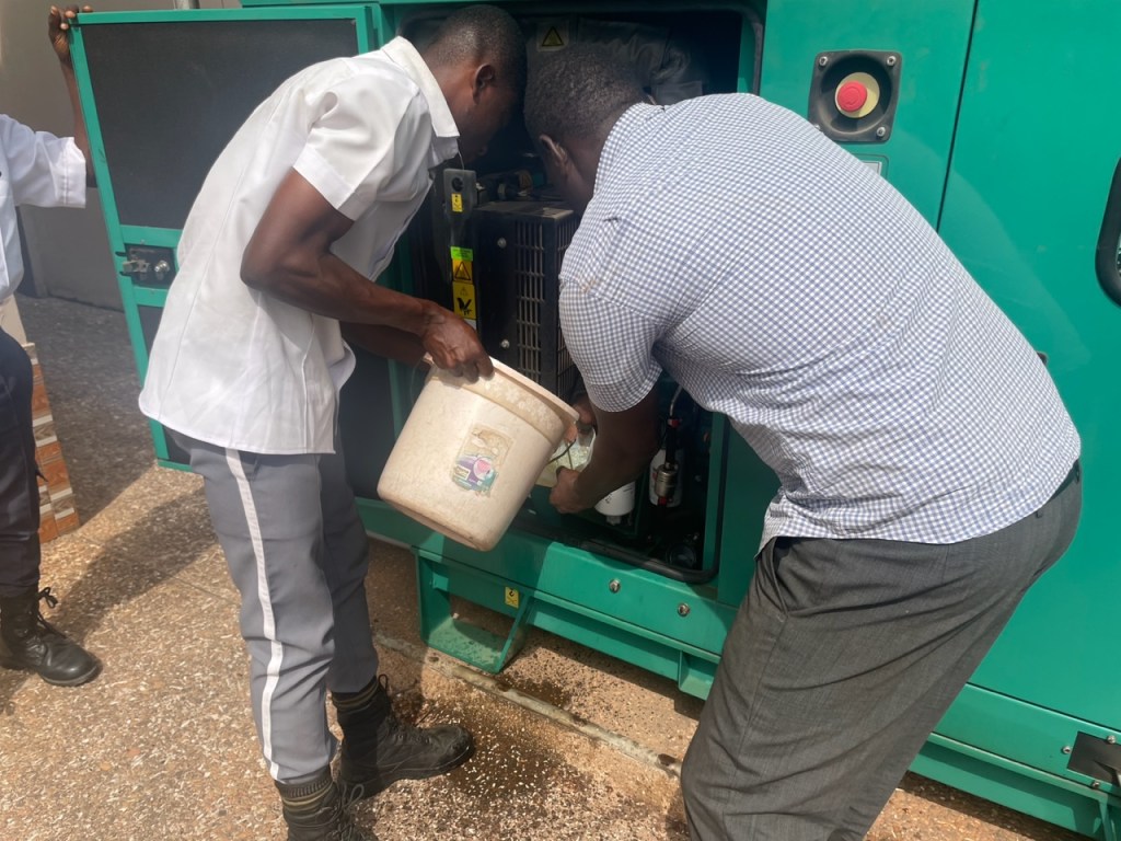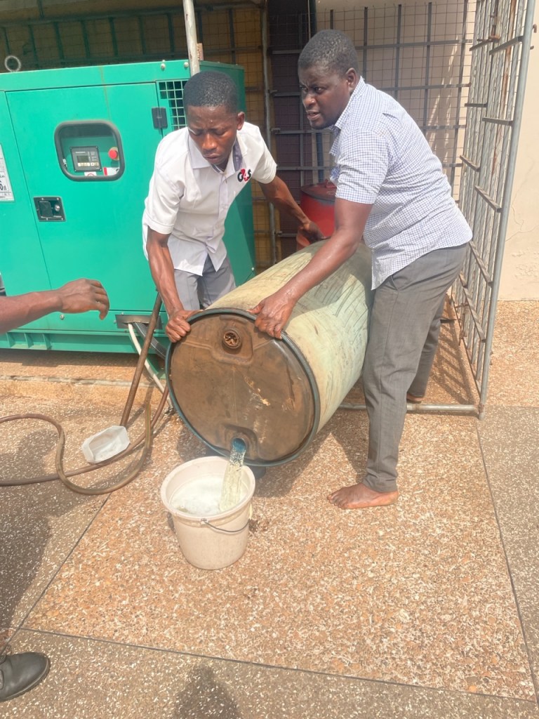 On Friday we became concerned as the diesel in the generator was getting low. The guards and the man who does the landscaping (President Duah – he serves as the branch president of the Adankwame Branch) emptied the last of the diesel stored in 55 gallon drums and put it into the generator (the old fashioned way). I knew unless we would get diesel on Saturday, the generator would run out before the day was over. Fortunately, our southern facilities manager, Aaron Allotey was able to get a guy to come over in his “bike truck” on Saturday morning and with one of our guards went and filled the barrels back up with diesel and brought them back. The Saturday afternoon guards then refilled the generator.