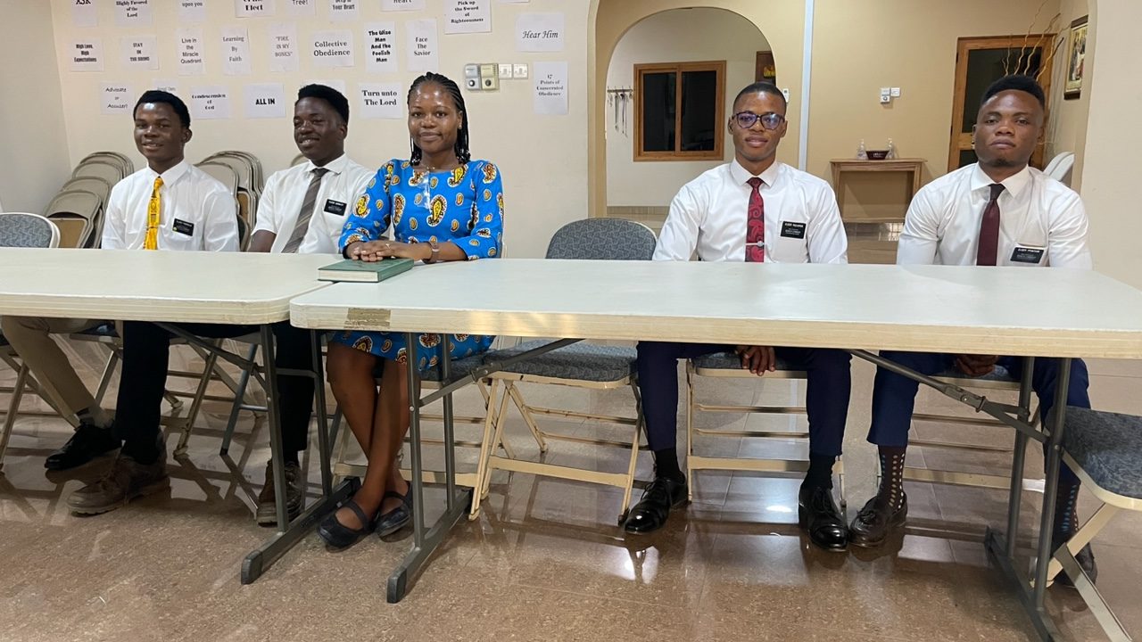 Elder Franklin, Elder Sorbley, Sister Ngabola, Elder Mulambo, Elder Ipantiar – all returning missionaries participating in the Self-Reliance discussion