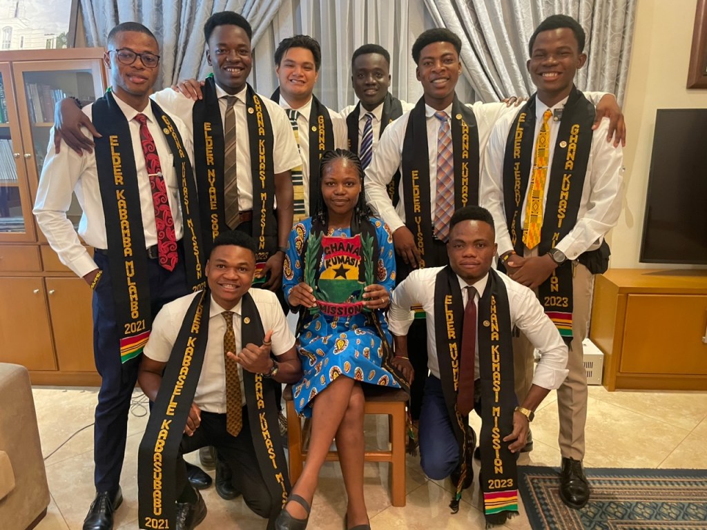 Back: Elder Mulambo (DR Congo), Elder Sorbley (Ghana), Elder Watch (New Zealand), Elder Sam (Ghana), Elder Adu (Ghana), Elder Franklin (Nigeria). Front: Elder Kabasubabu (DR Congo), Sister Ngabola (Zimbabwe), Elder Ipantiar (DR Congo)