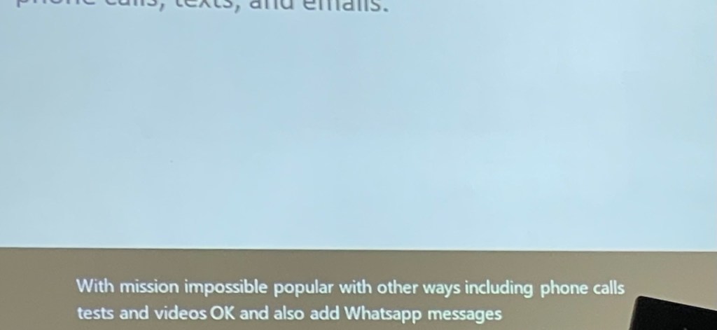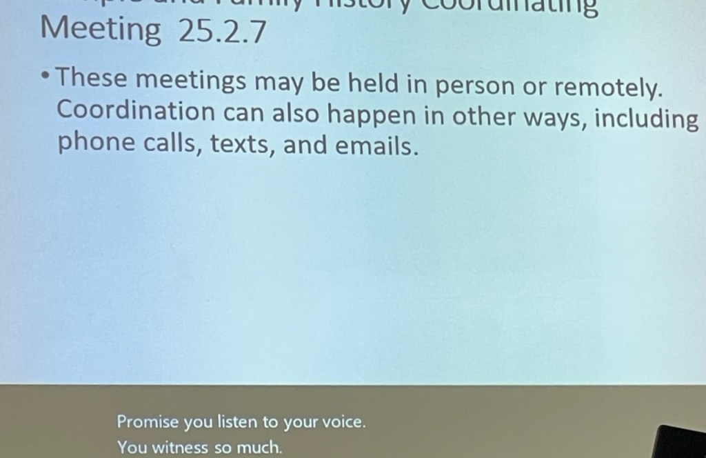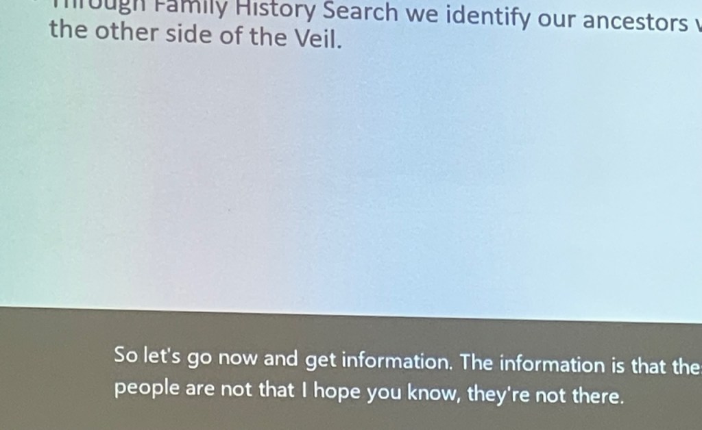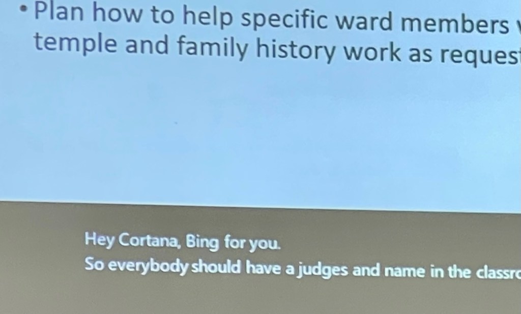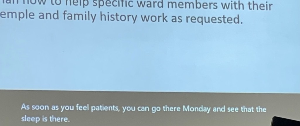 After the broadcast, we started the priesthood and organizational leadership meeting at 10:20 am and ended at noon. There were 61 leaders from the district in attendance. Topics included the following: 1) Beware of Pride and living outside of our means. 2) Following Jesus Christ “straightway” and laying our wills upon the altar and not getting ensnarled in the “nets of the world”. 3) Jude 1:14-16 – we will all be judged and if there is ungodliness in us we will be convinced of it at the day of judgment. 4) Gathering Israel on both sides of the veil. The last topic was presented by Elder Kaku and focused on Missionary Coordination Meetings and Temple and Family History work Coordination Meetings. For some reason the close captioning was active on the laptop Elder Kaku was using and so it was trying to pickup his voice and translate it to close captioned sentences. Because he is Ghanaian and he was not using a microphone, the transcription was often quite funny. The presentation was so well done and the transcription provided some entertainment along the way. LaDawn and I may have been the only two that noticed. I couldn’t help but take a few pictures. The close captioning is at the bottom in the gray section.