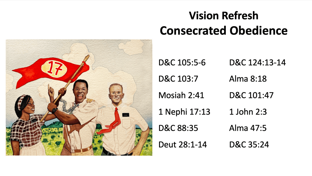 Thursday was our Mission Leadership Council. It is always our favorite meeting of the transfer as we have the opportunity to meet with the amazing, consecrated, diligent, and inspired Sister Training Leaders, Zone Leaders, and Assistants. This past week was no exception. Below is the agenda for the meeting and a slide for the vision refresh on Consecrated Obedience. Due to time constraints we only discussed 6 of these scriptures. I identify scriptures on the topic and then come up with questions (without a clear answer) that we can discuss. It was glorious to hear some of the responses and how the discussion became a tapestry of principles related to the importance of obedience.