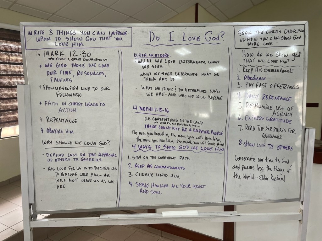 Following the Sister Training Leaders and the testimonies of those missionaries going home at the end of the transfer, LaDawn led a discussion called, “Do I Love God”. She did a great job of asking the right questions, reading the right scriptures, and sharing the best quotes. For each of her instructions, I kept the whiteboard up to date with the things she was teaching. It is good for missionaries to be able to see a visual representation of what they are learning, so we try to do this as much as we can knowing that it helps them to take notes that they can refer back to at a later time.